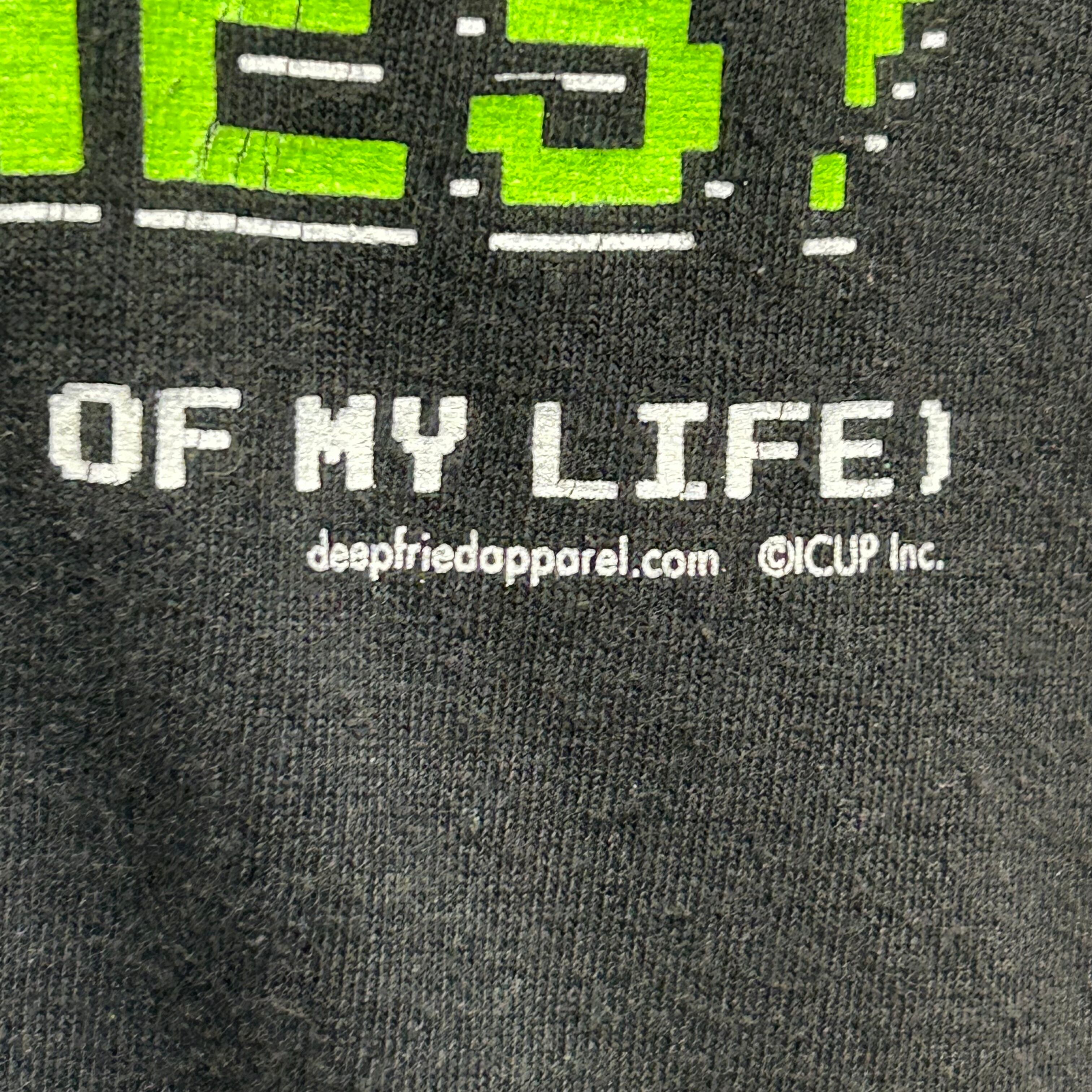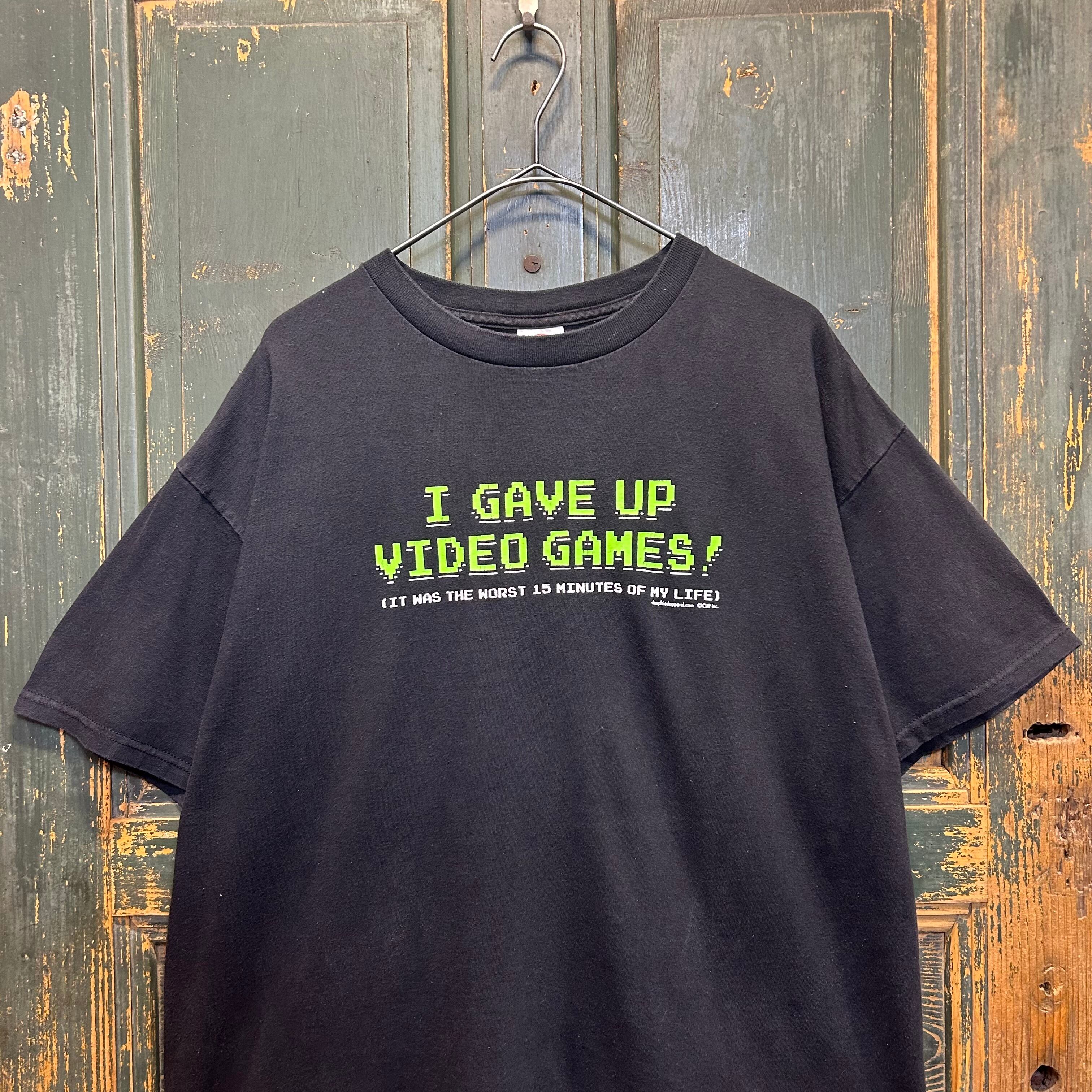 「I GAVE UP VIDEO GAMES!(ゲームを諦めた!)」と書かれたTシャツです。