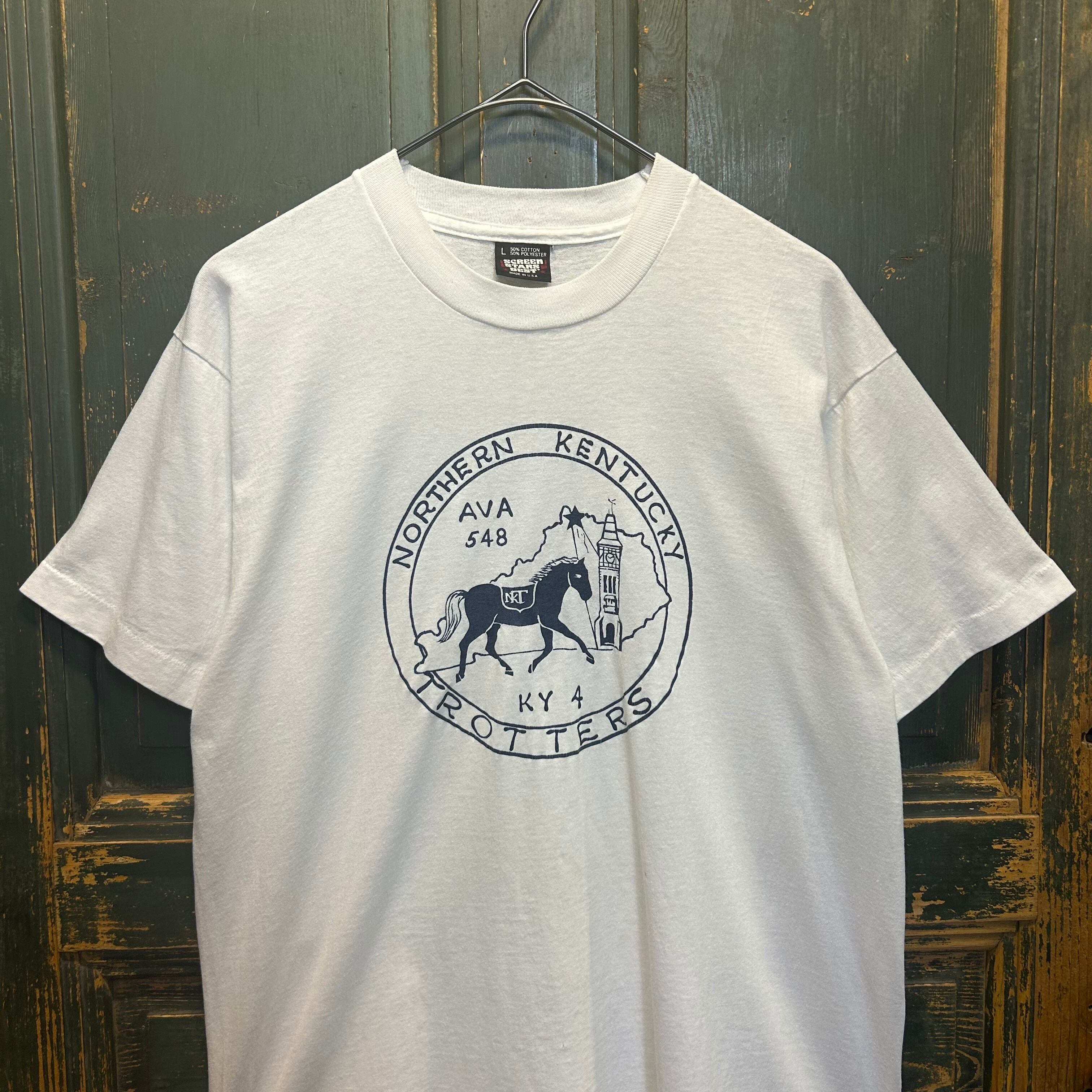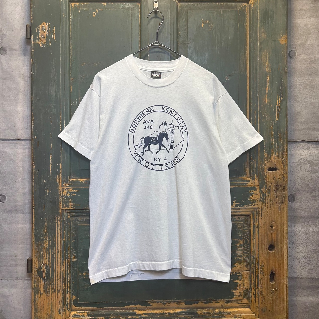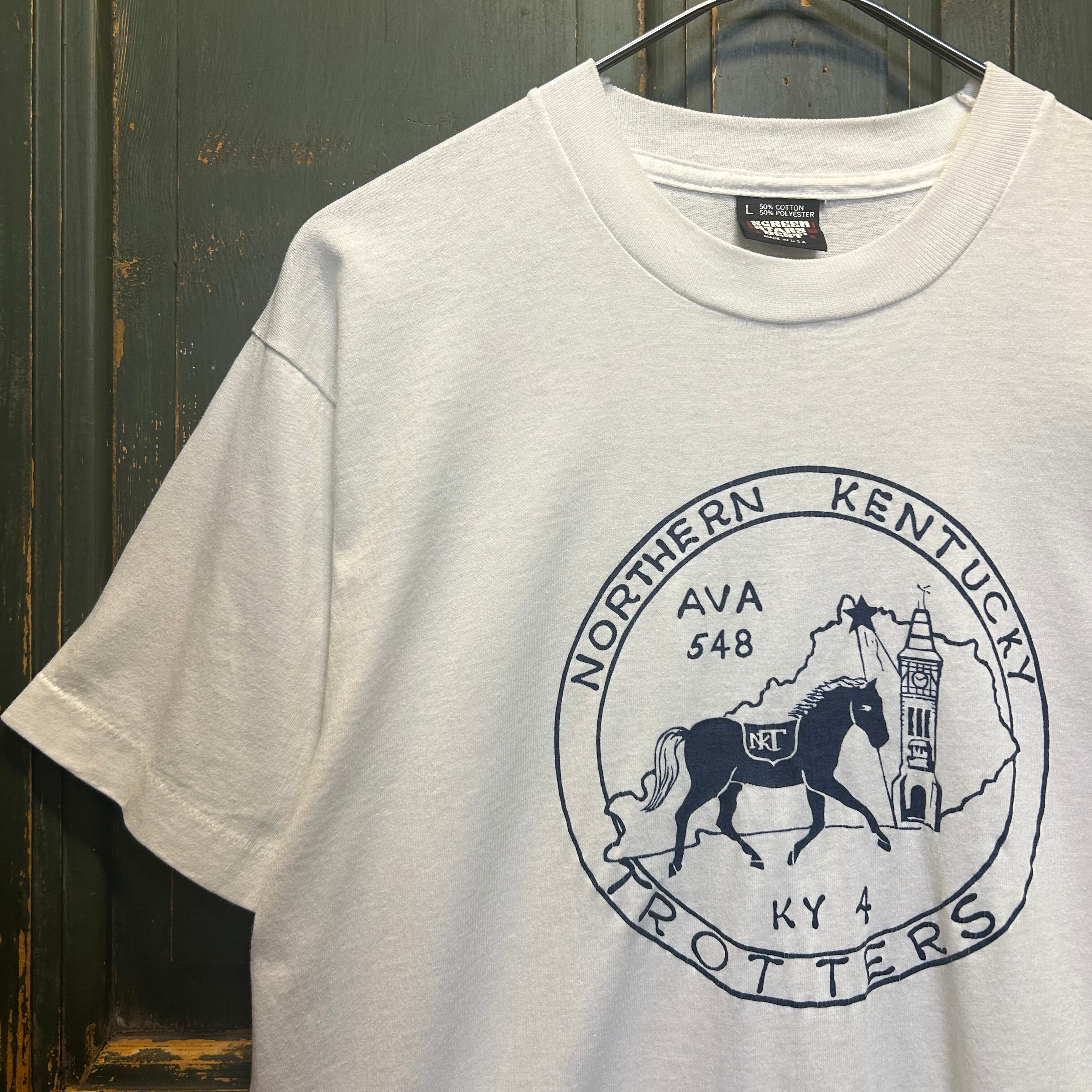 ケンタッキー州北部を拠点とする馬の速歩競走クラブのロゴを模したデザインが施されたTシャツです。
