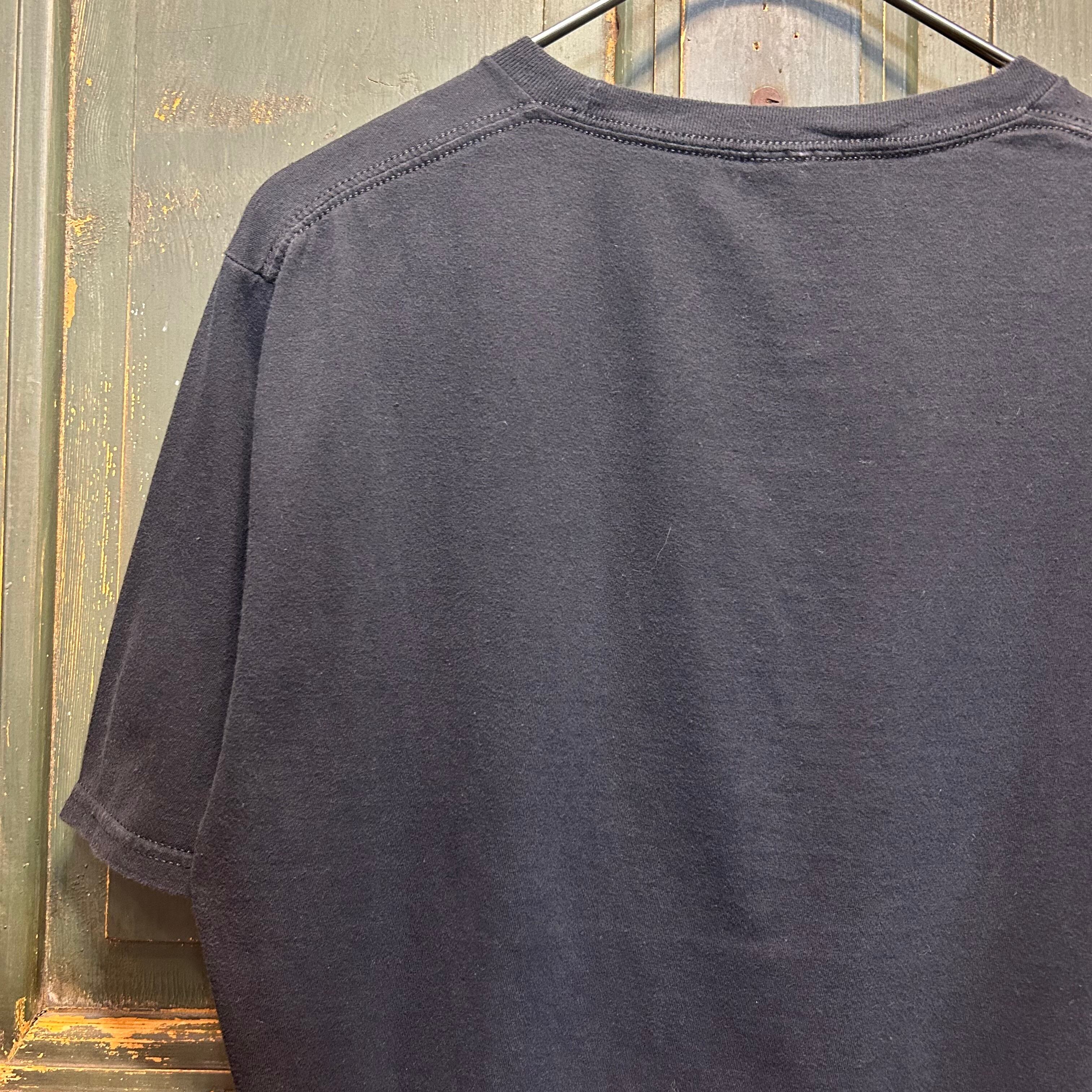 ブラックボディに青と赤のプリントが映えていて、目を引くTシャツです。