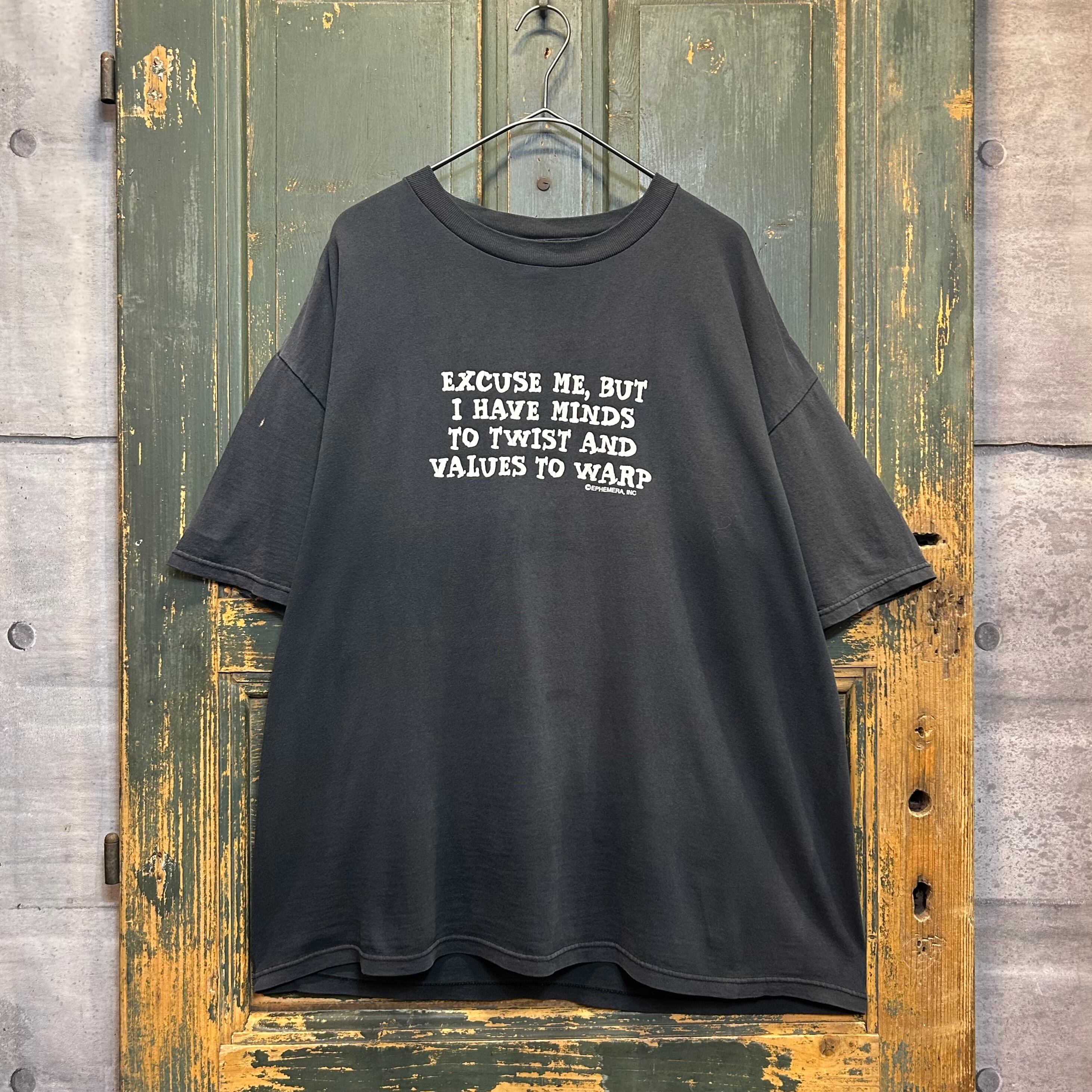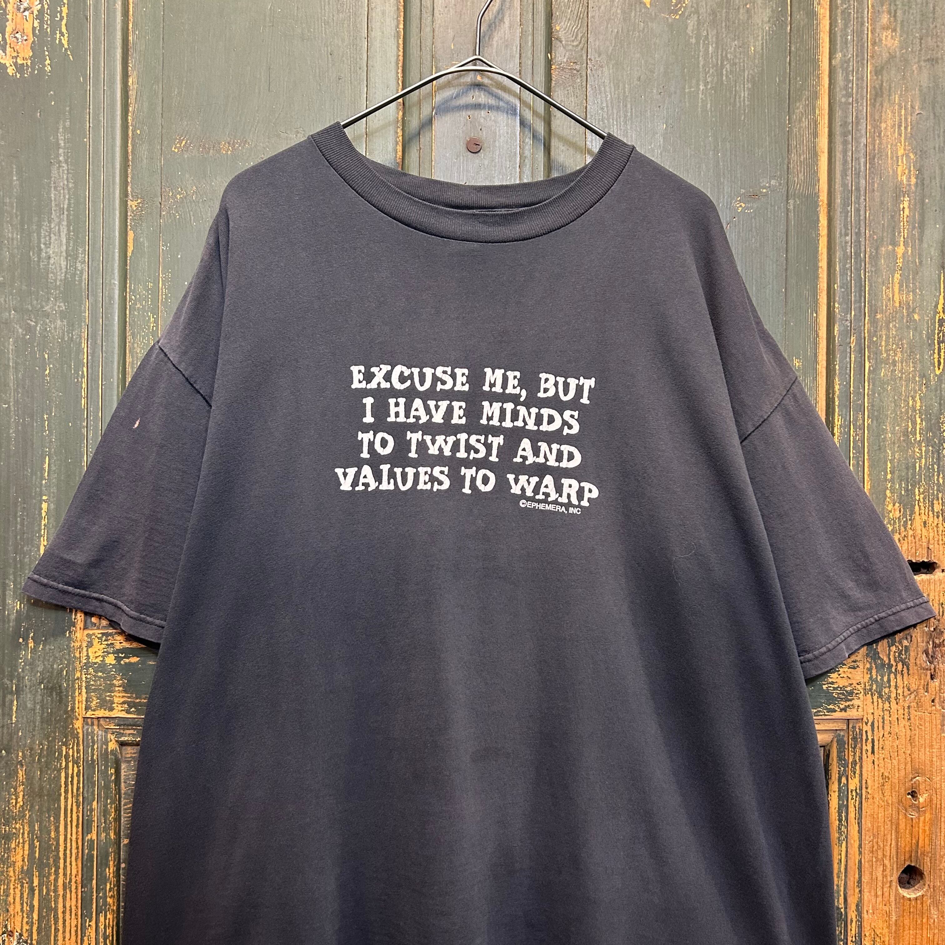 EXCUSE ME, BUT I HAVE MINDS TO TWIST AND VALUES TO WARP(失礼だが、私には捻じ曲げたい心と歪めたい価値観があるんだ) 既存の考え方や価値観を疑問視しているようなインパクトのあるメッセージプリントになっています。