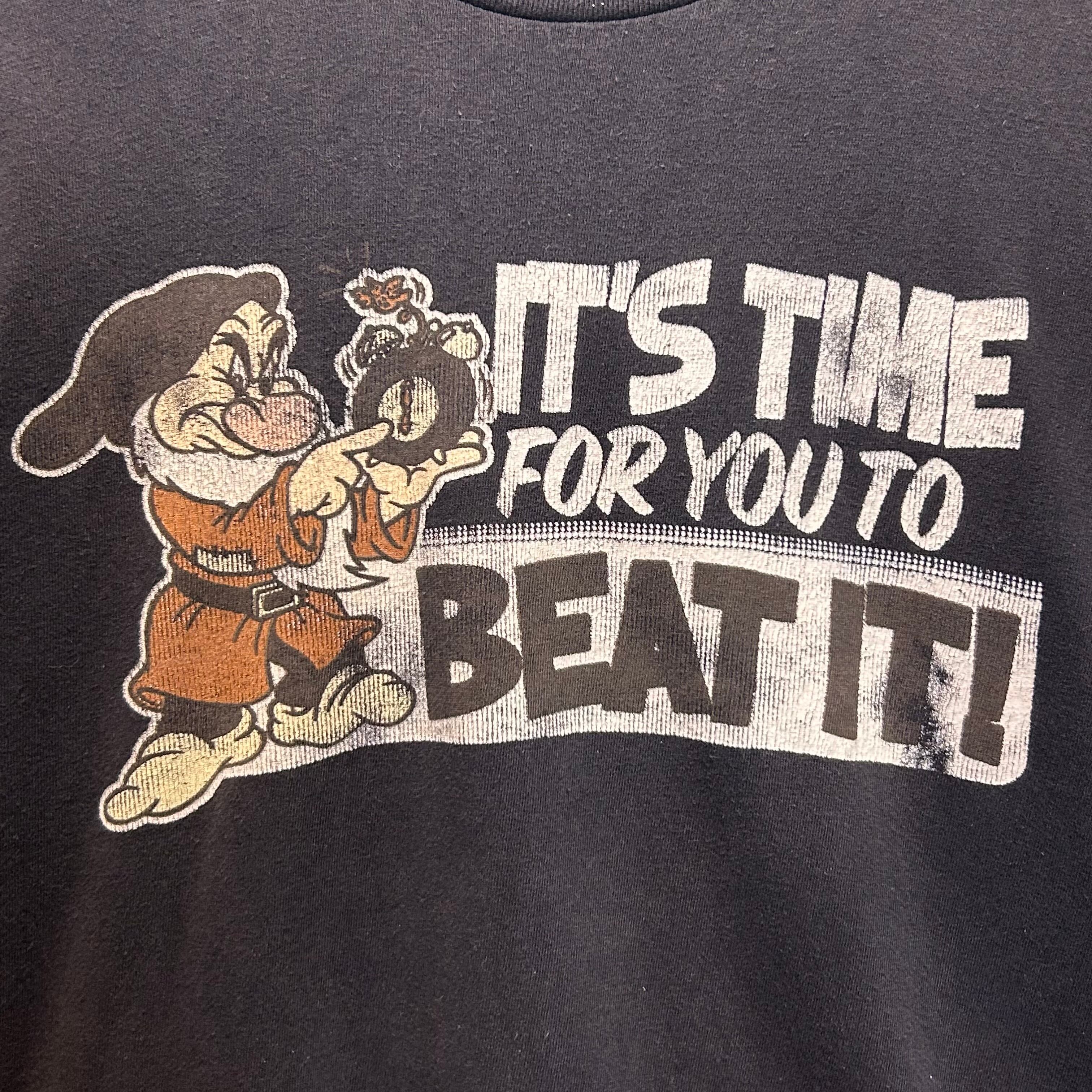 「IT'S TIME FOR YOU TO BEAT IT!」という英文が書かれており、これは「お前はもう消え失せろ!」や「お前はもう出て行け!」といった意味のグランピーらしさ全開のプリントになっています。