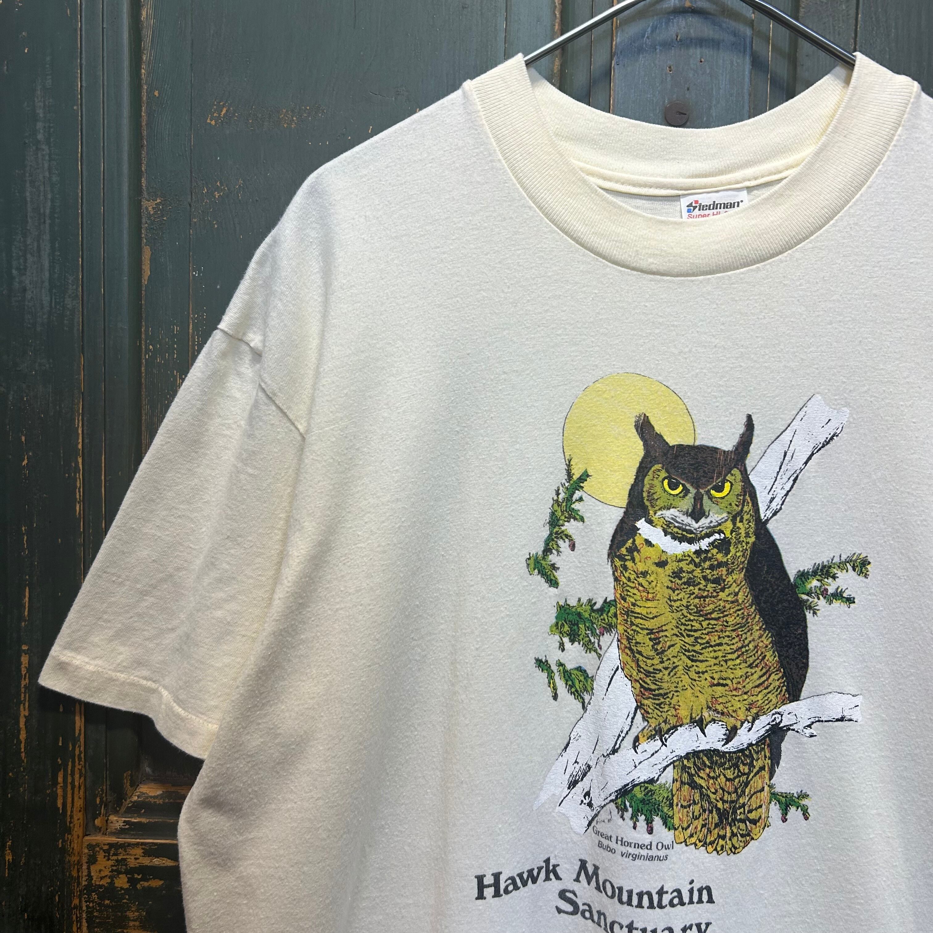 中央には枝にとまったフクロウが描かれており、ポップすぎないまとまったデザインのアニマルTです。