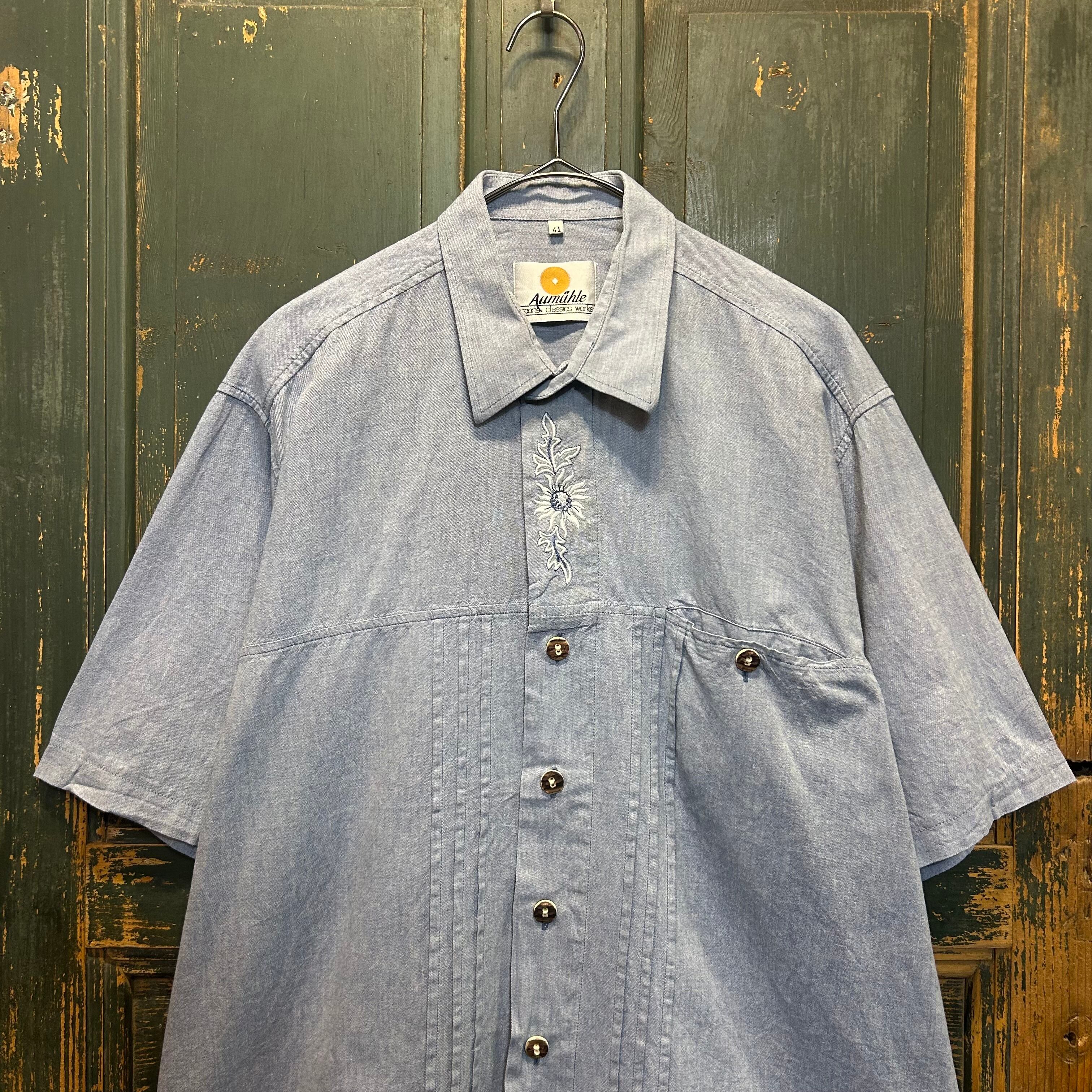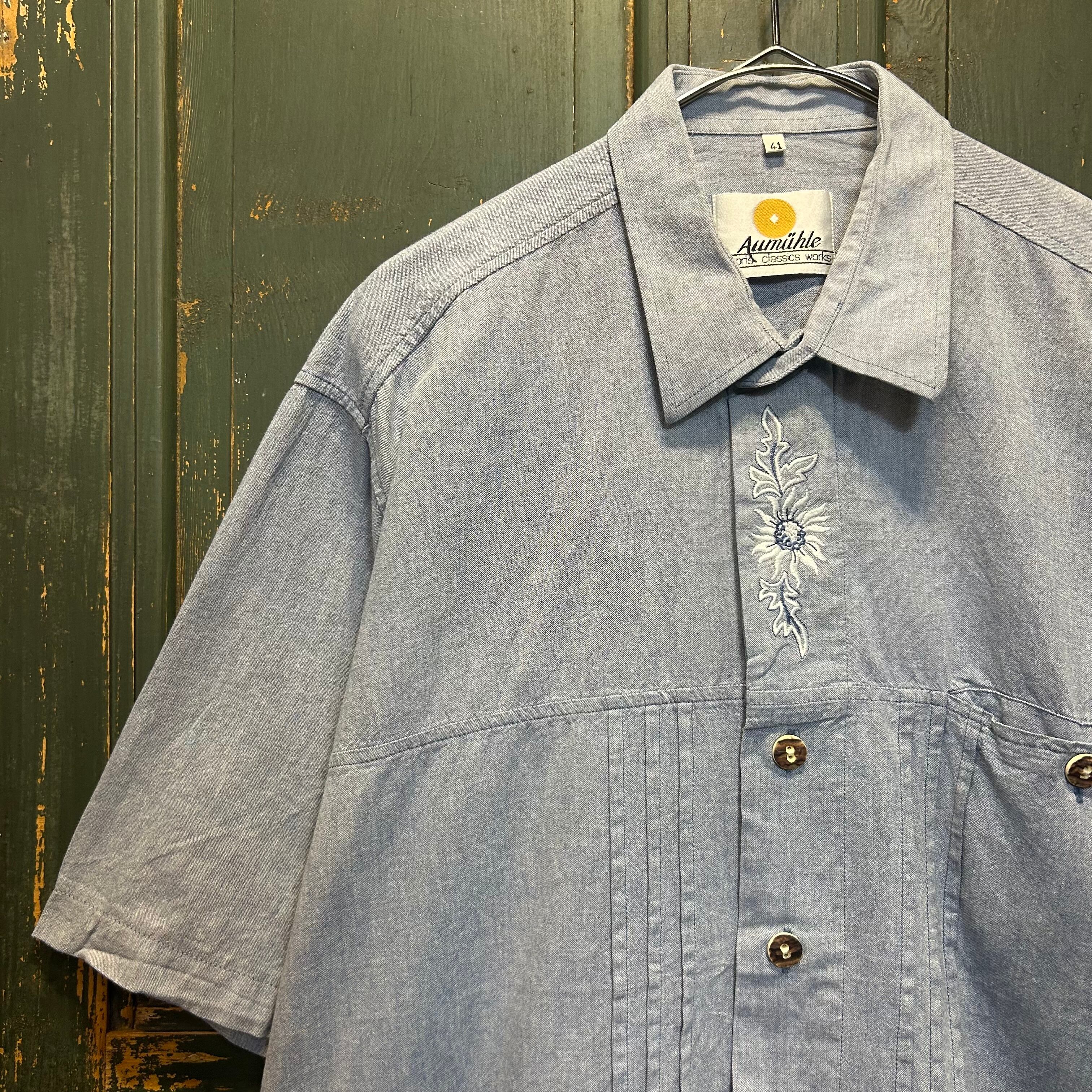 ホワイトやベージュのものが多いチロリアンシャツですが、こちらはブルーカラーになっています。