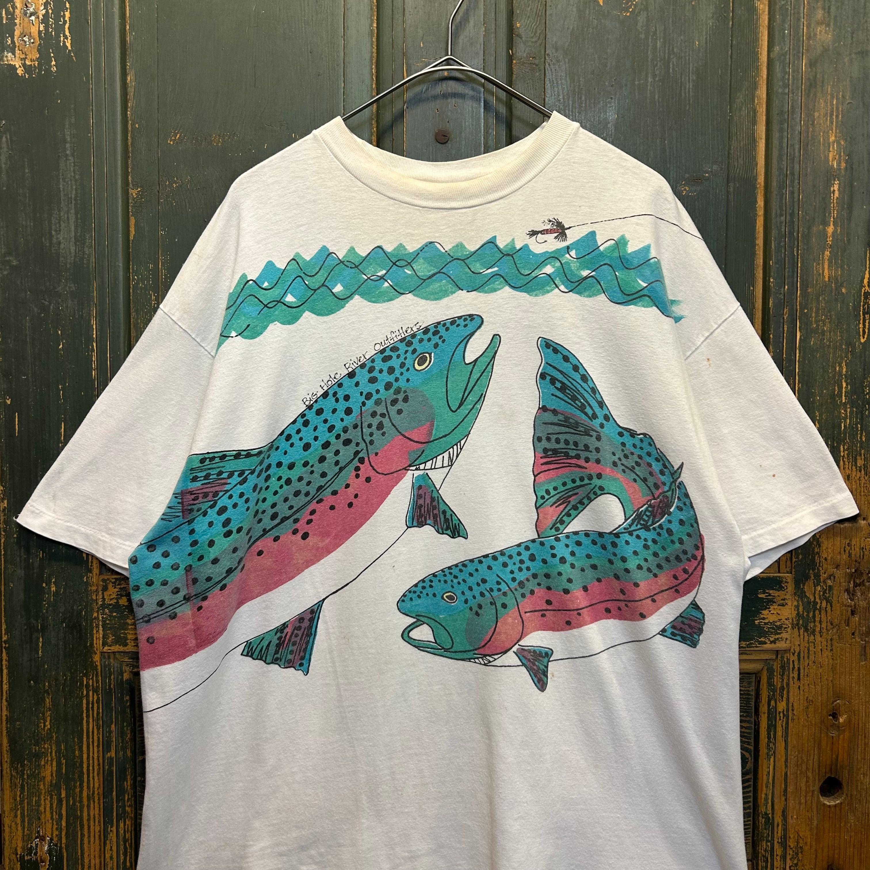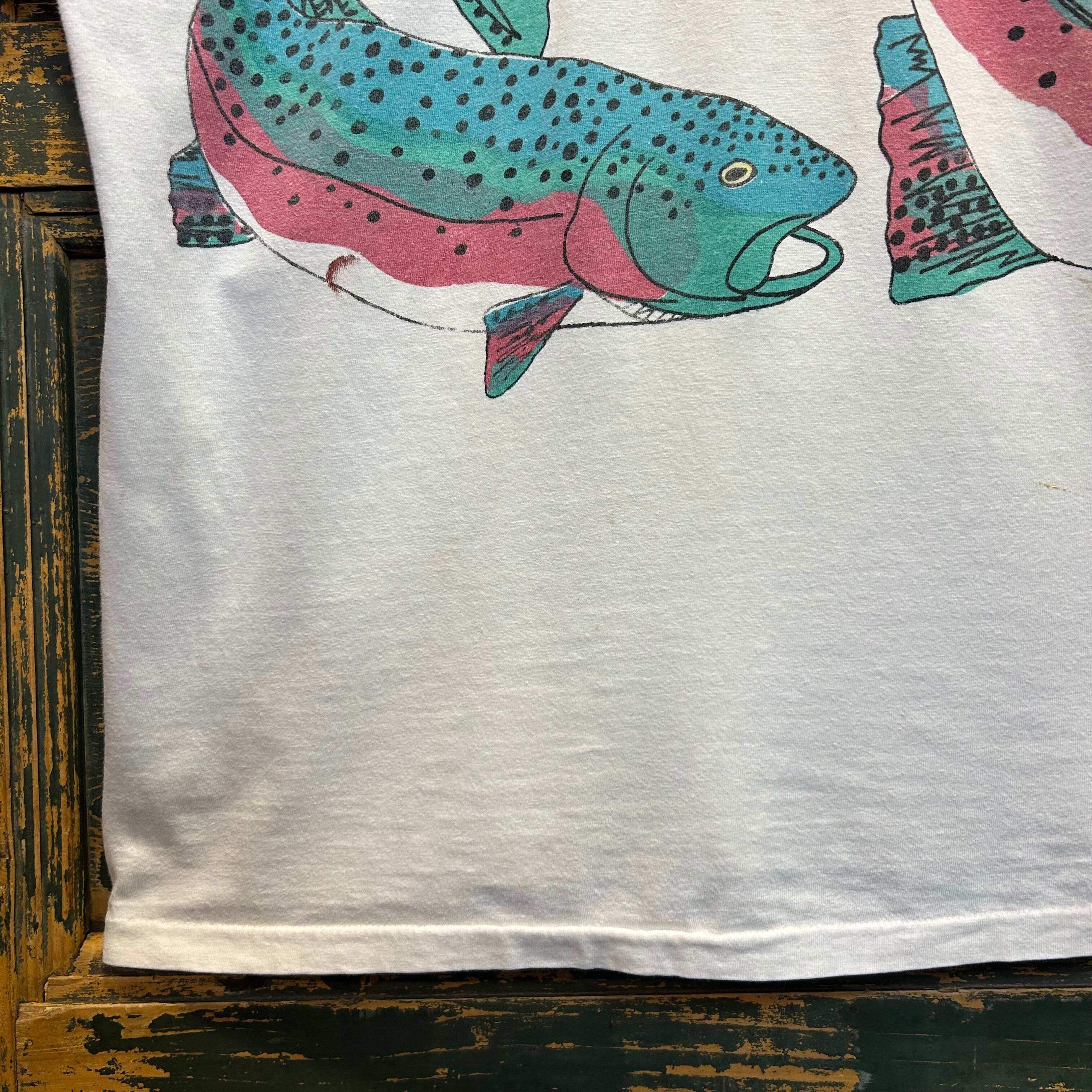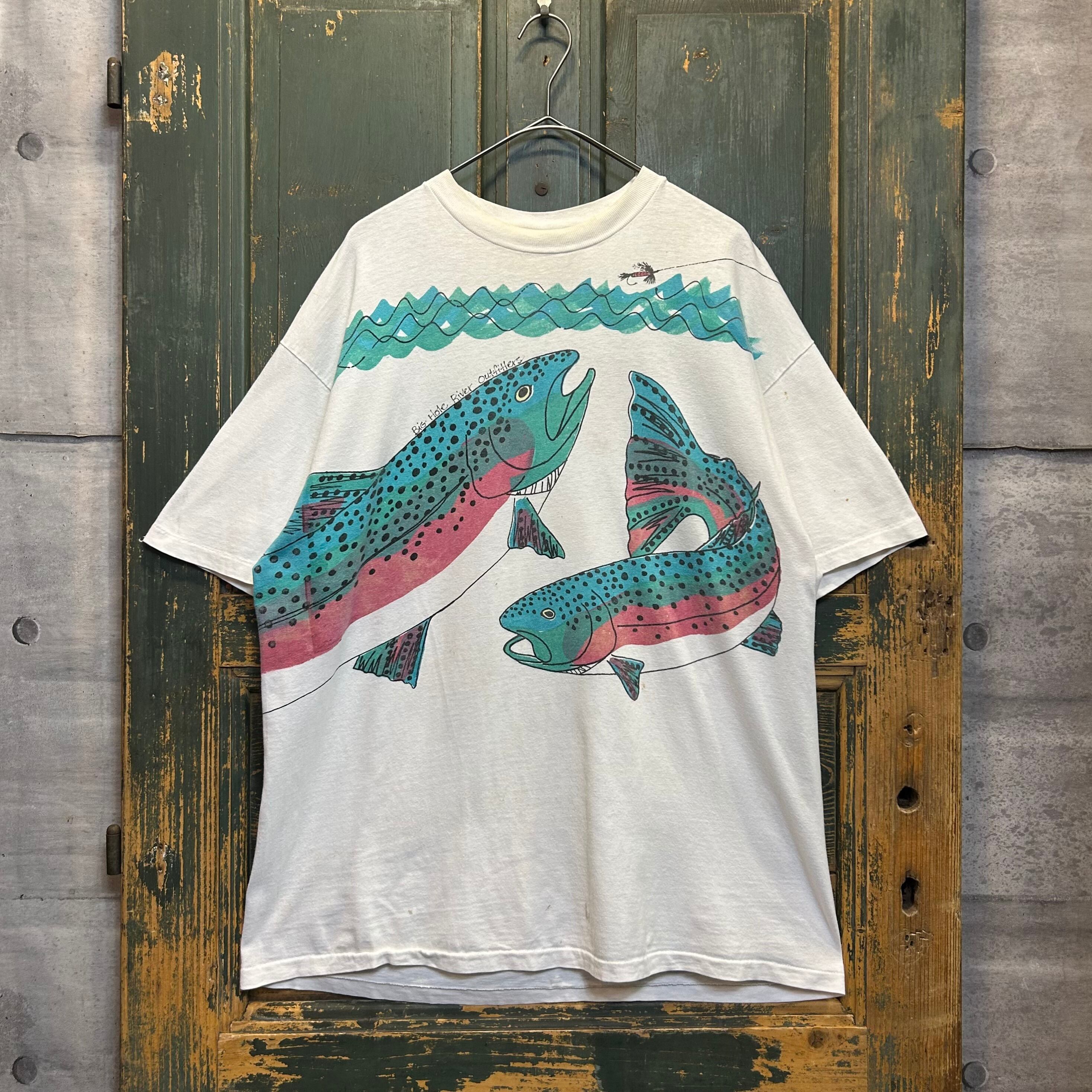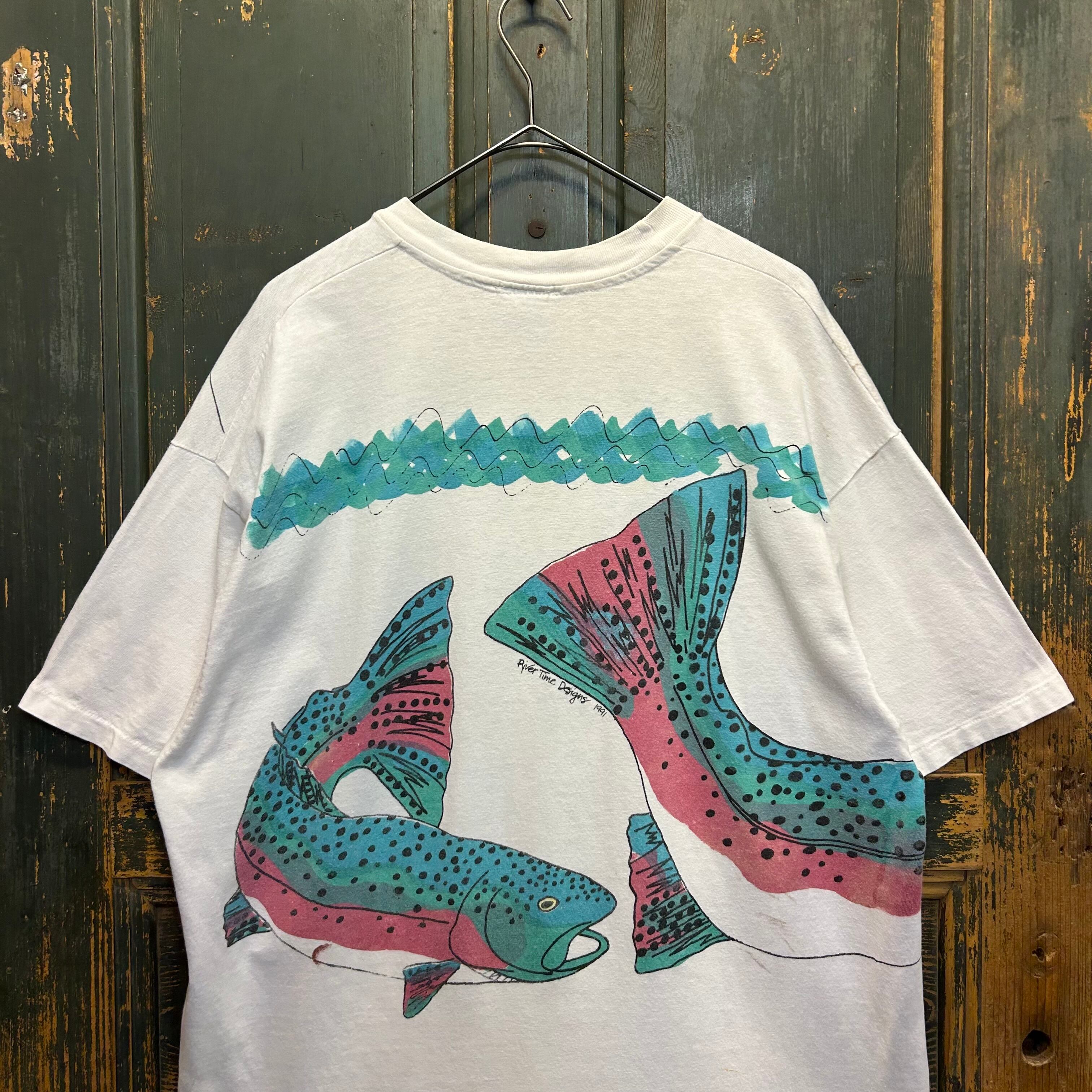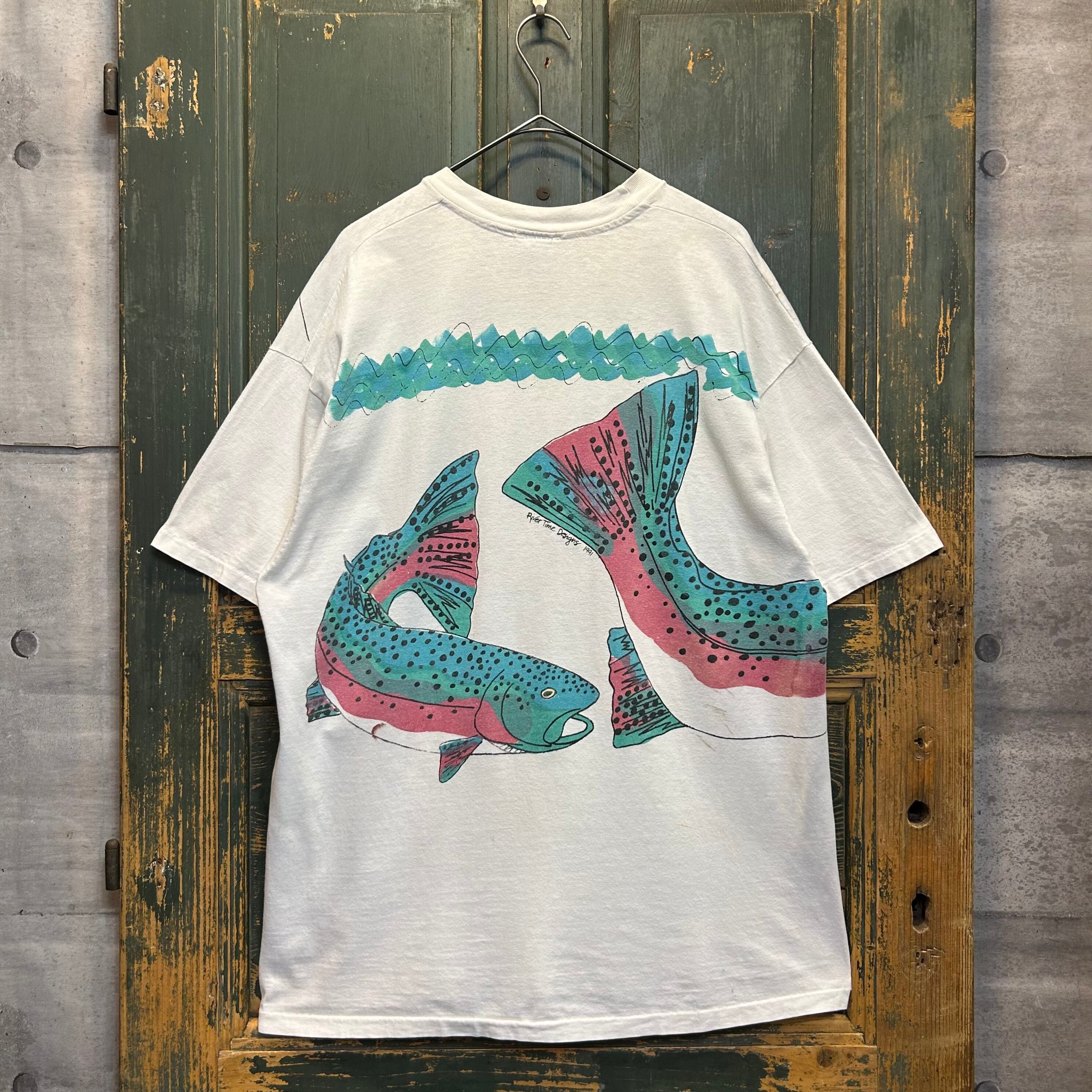 ニジマスと思われる魚が水中を泳いでいる様子が両面にプリントされたTシャツです。