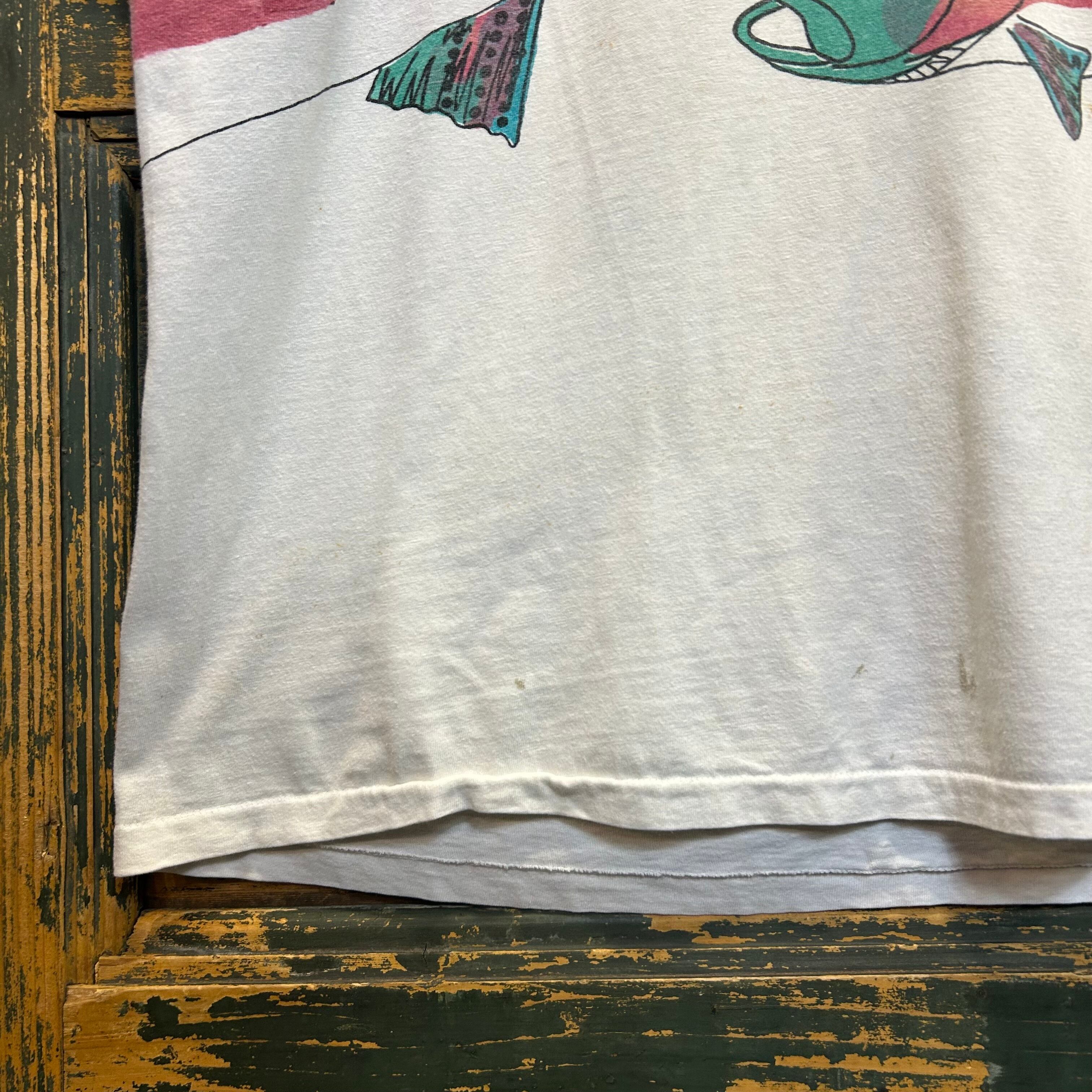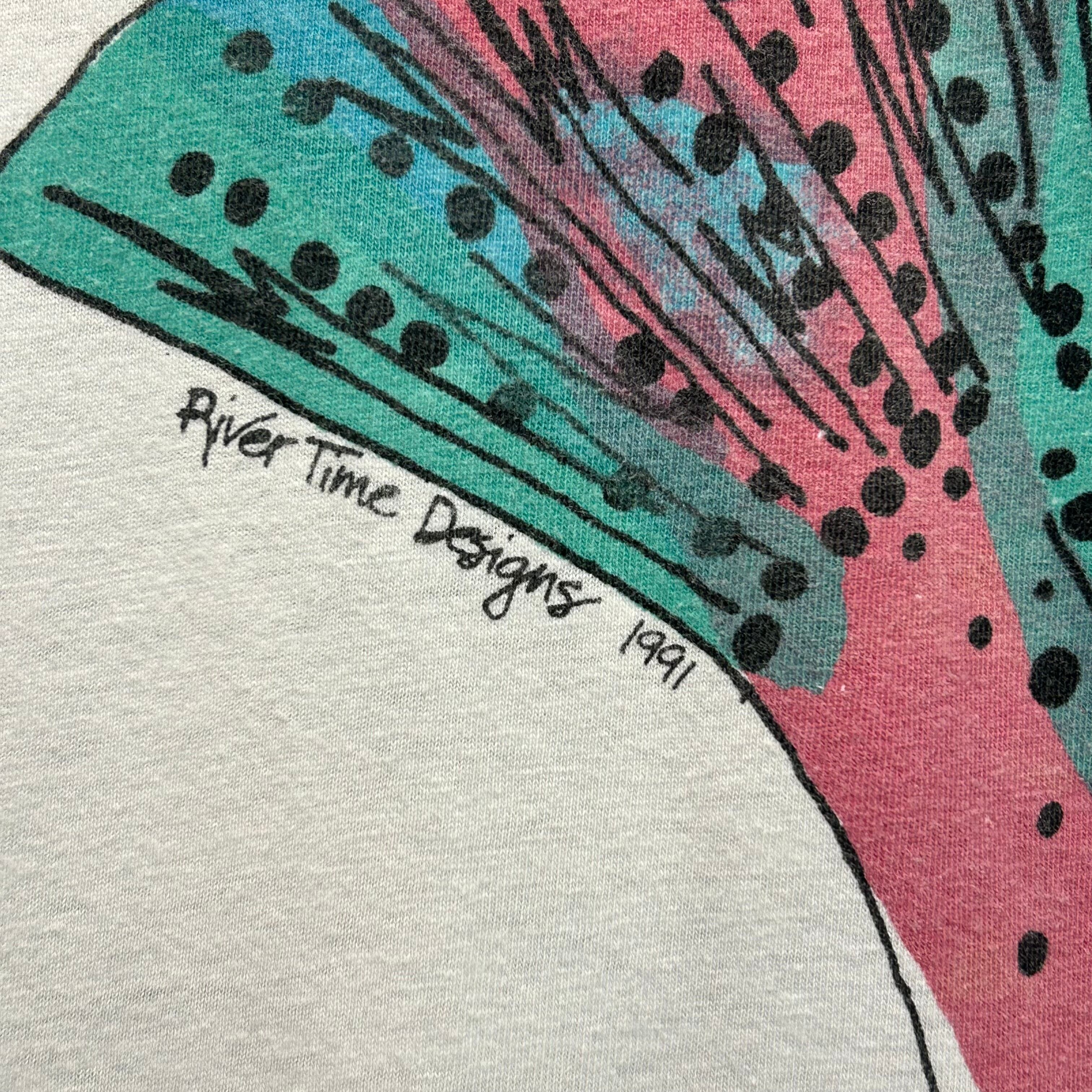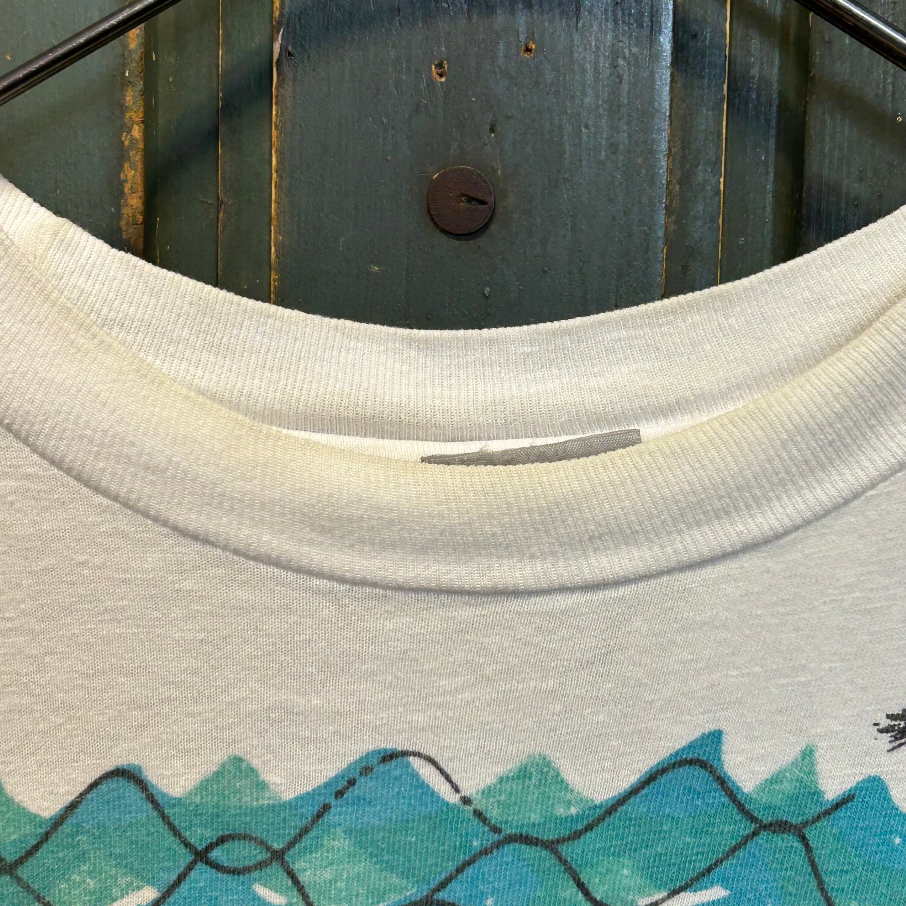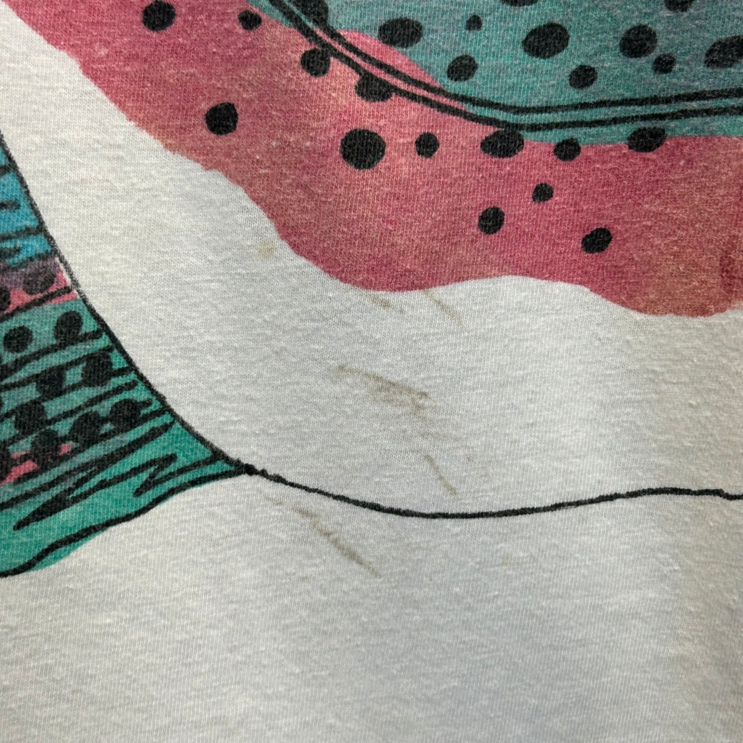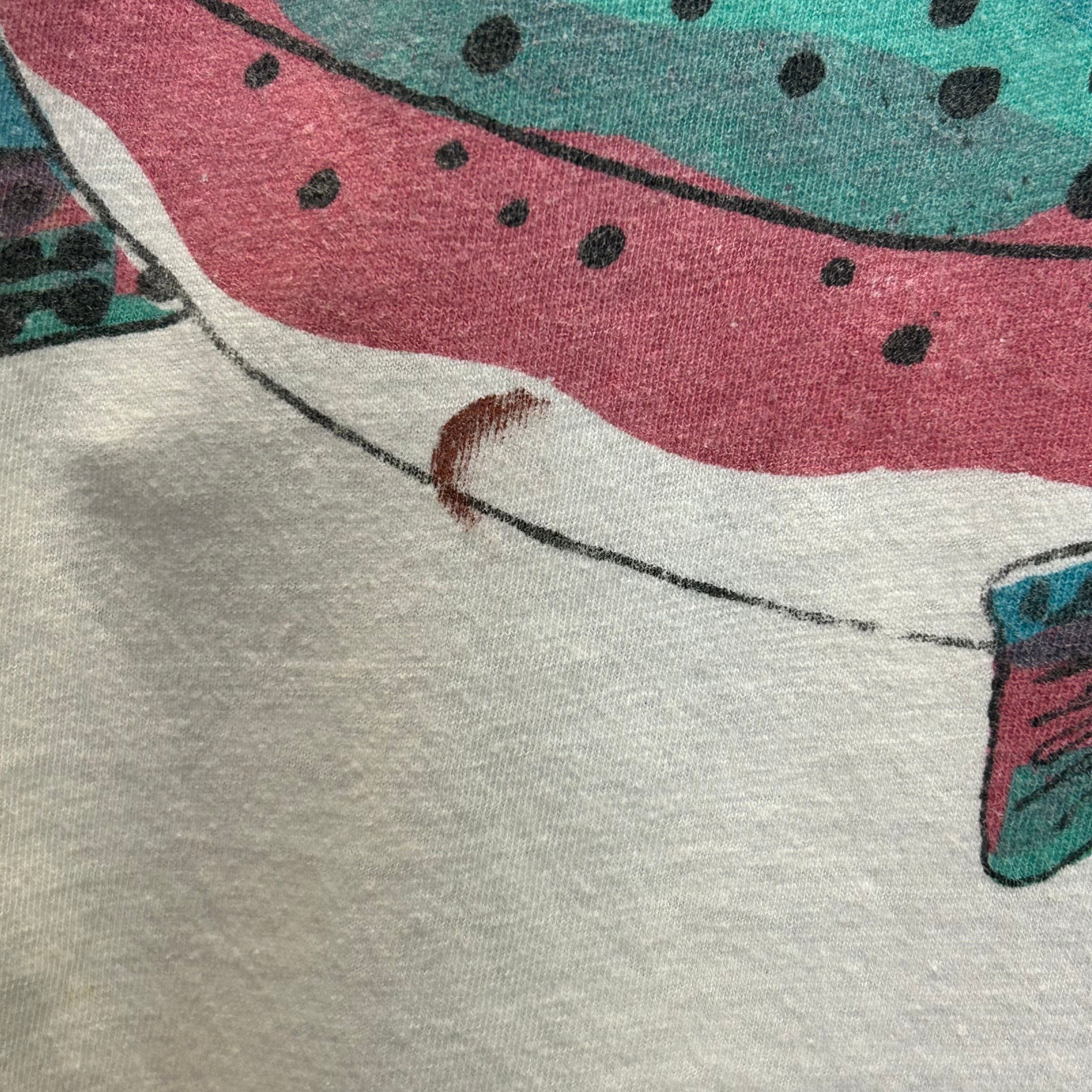 ニジマスと思われる魚が水中を泳いでいる様子が両面にプリントされたTシャツです。