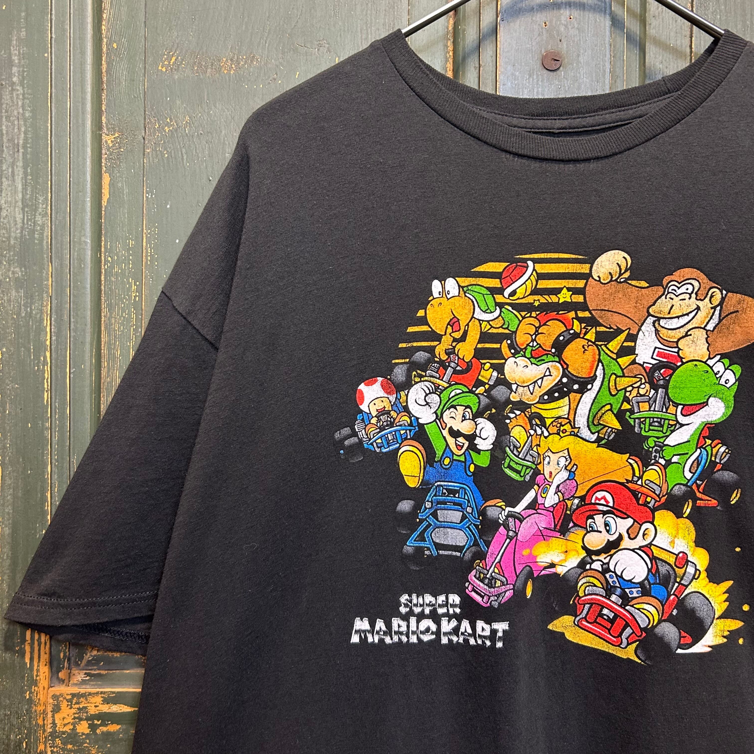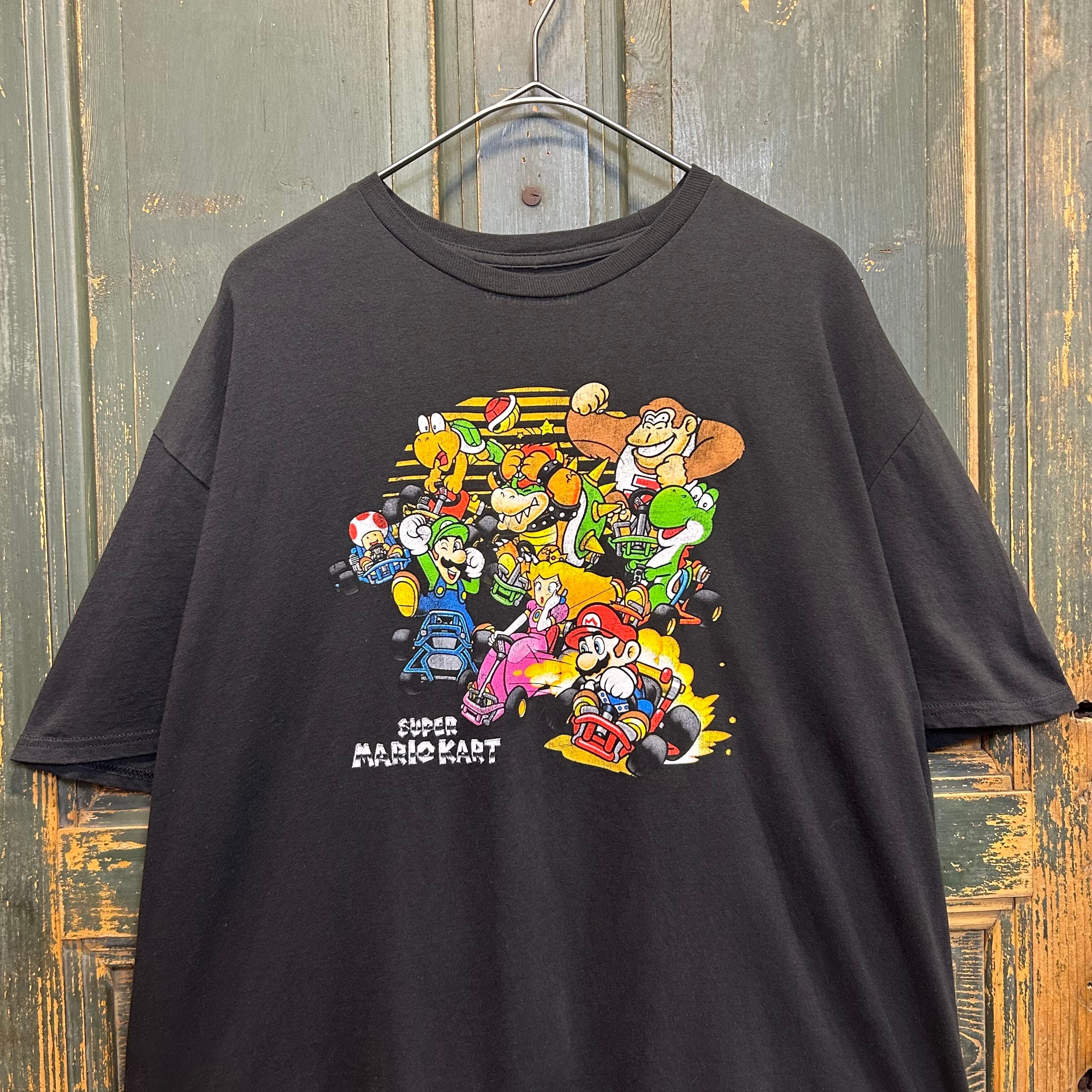 スーパーマリオカートのキャラクターがカートに乗ってレースをしている様子が描かれたTシャツです。