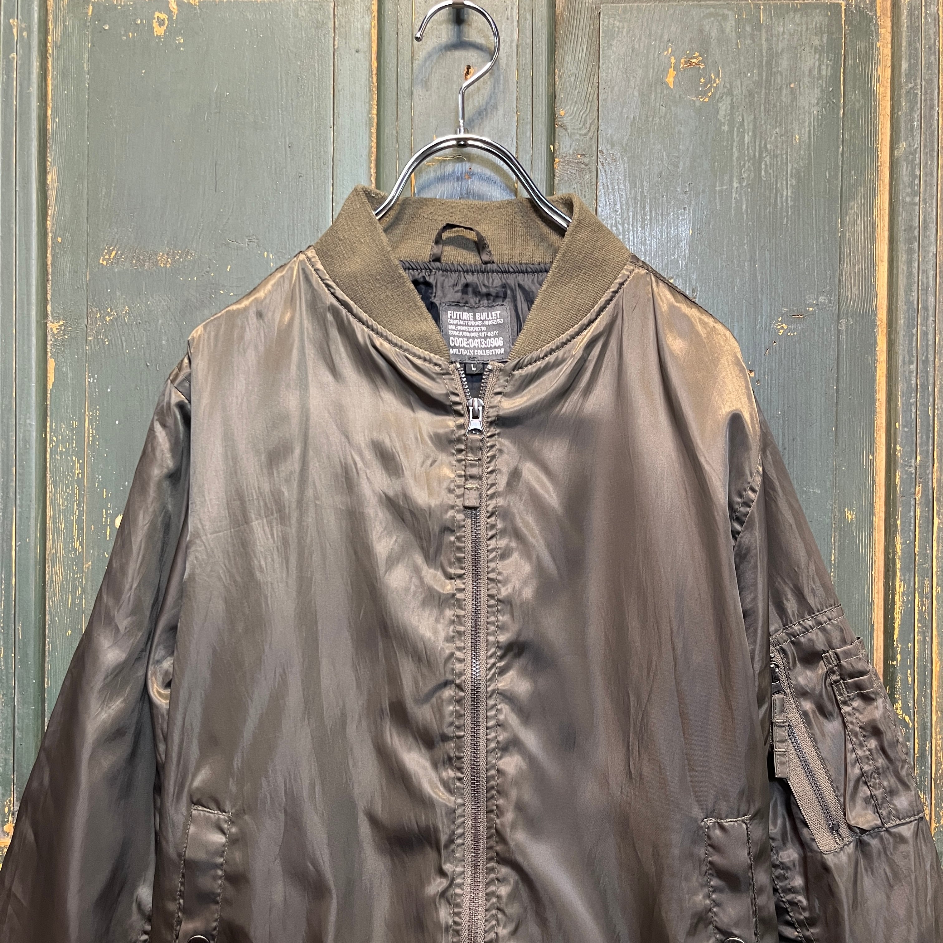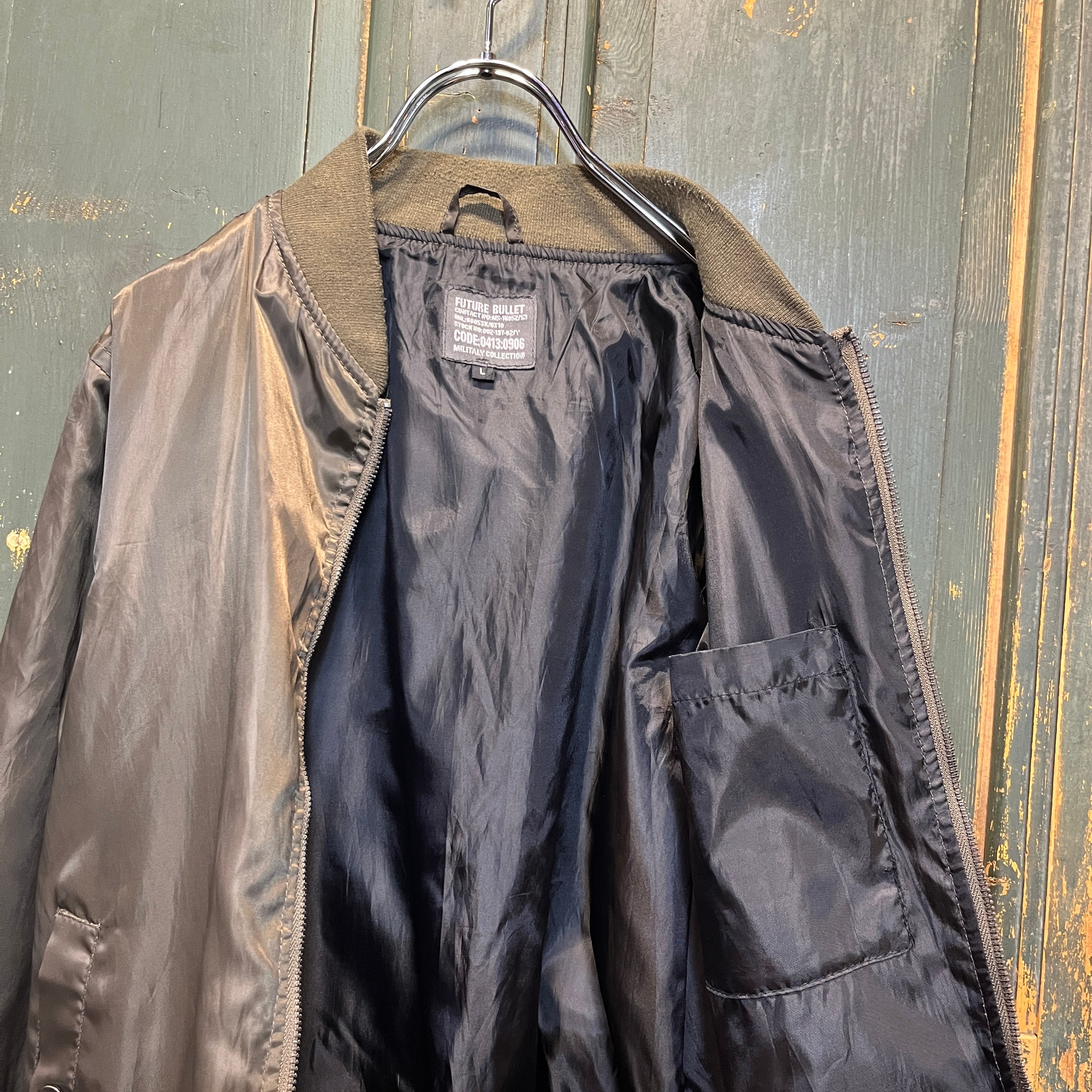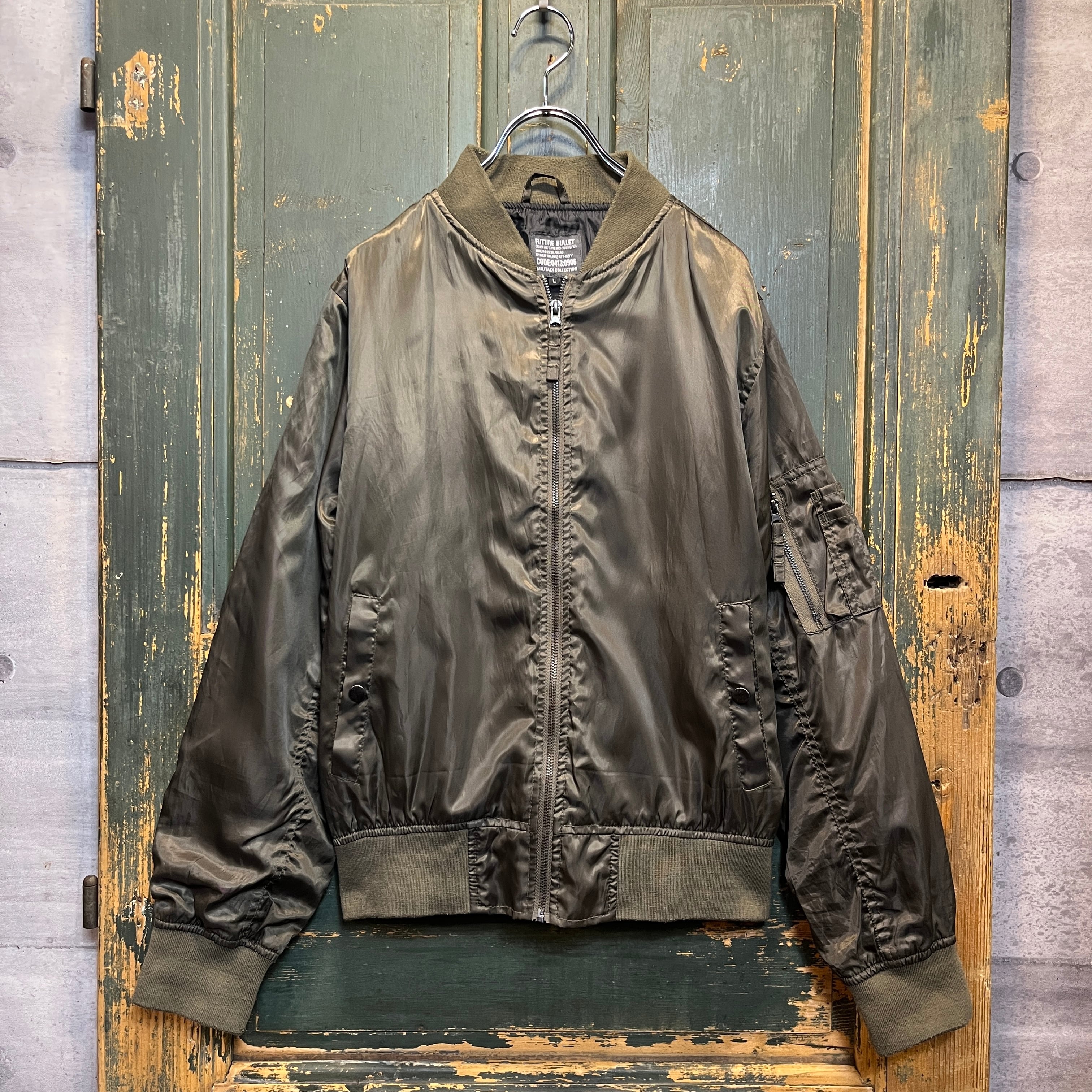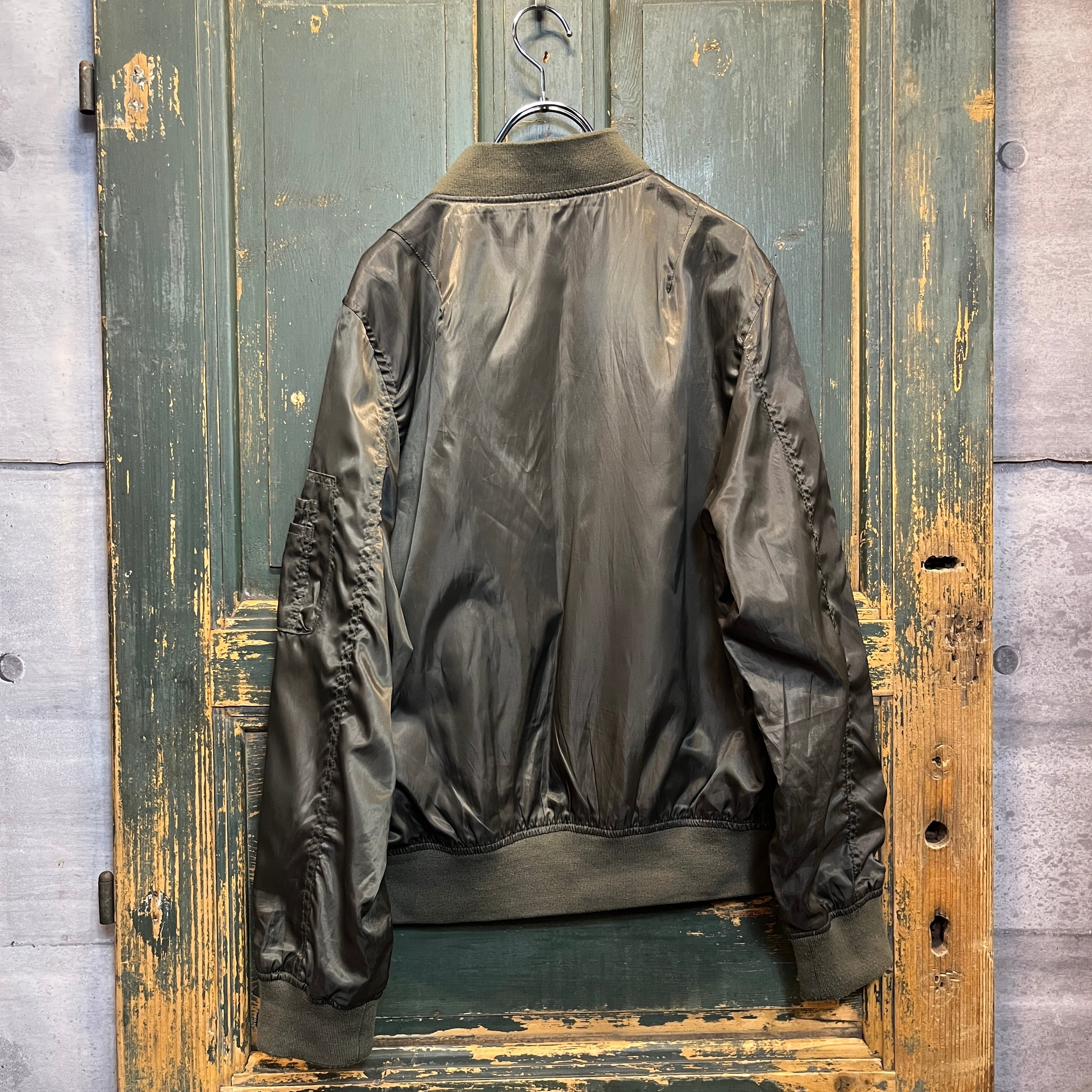 カーキとオリーブの中間ぐらいの色合いのMA-1型のジャケットです
