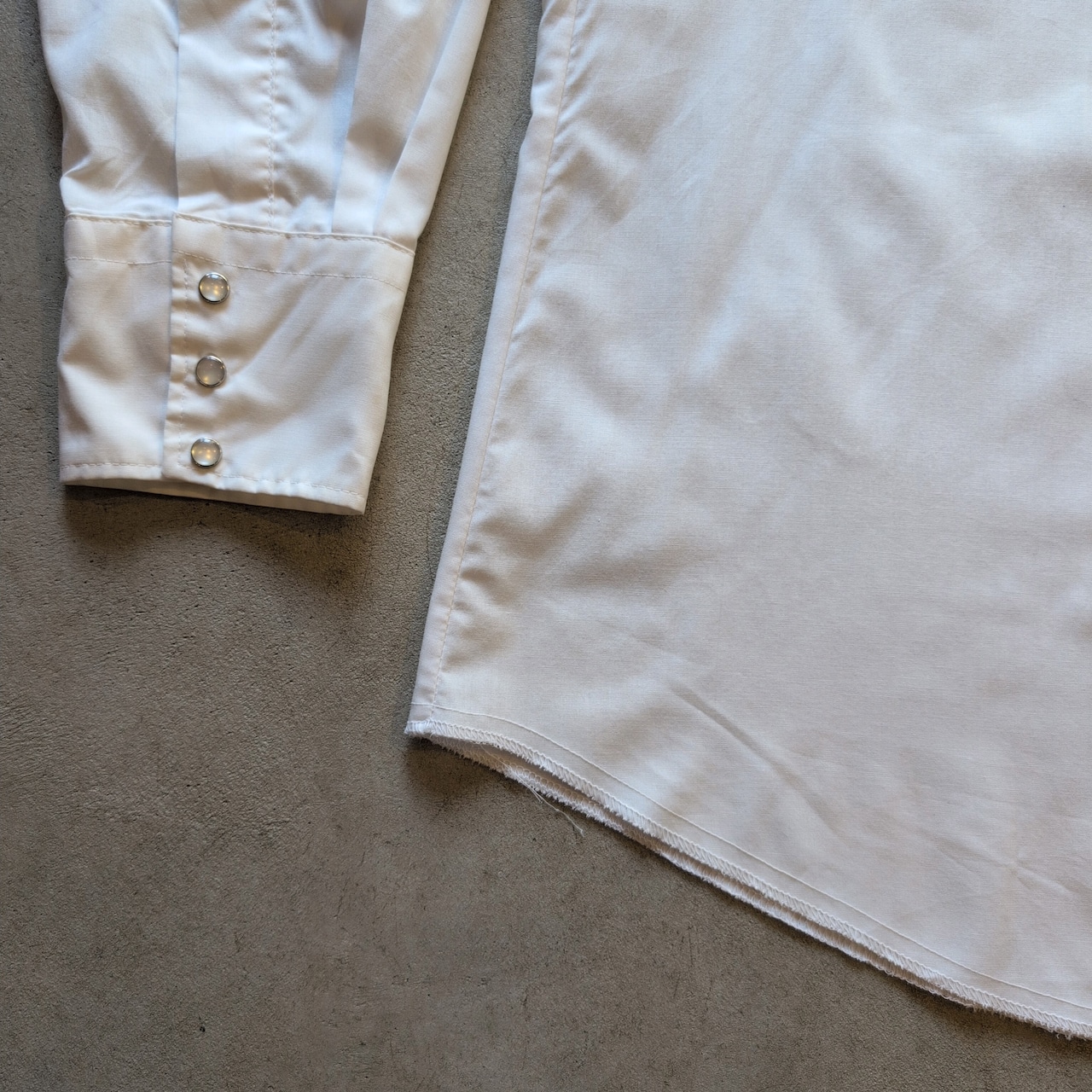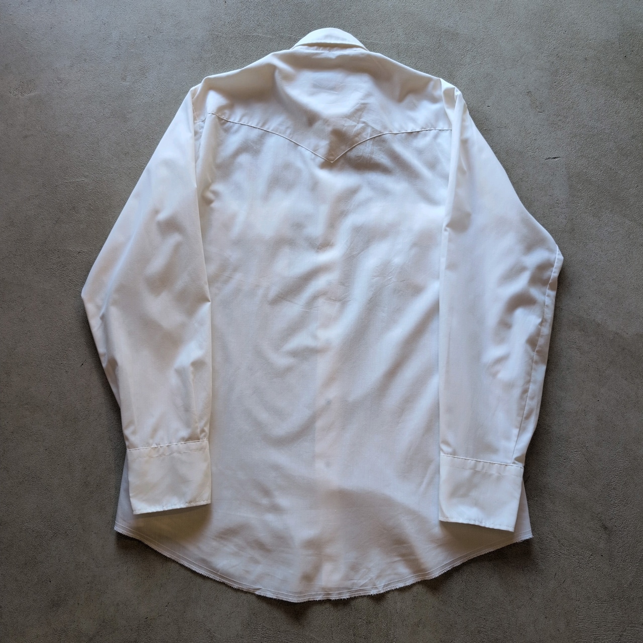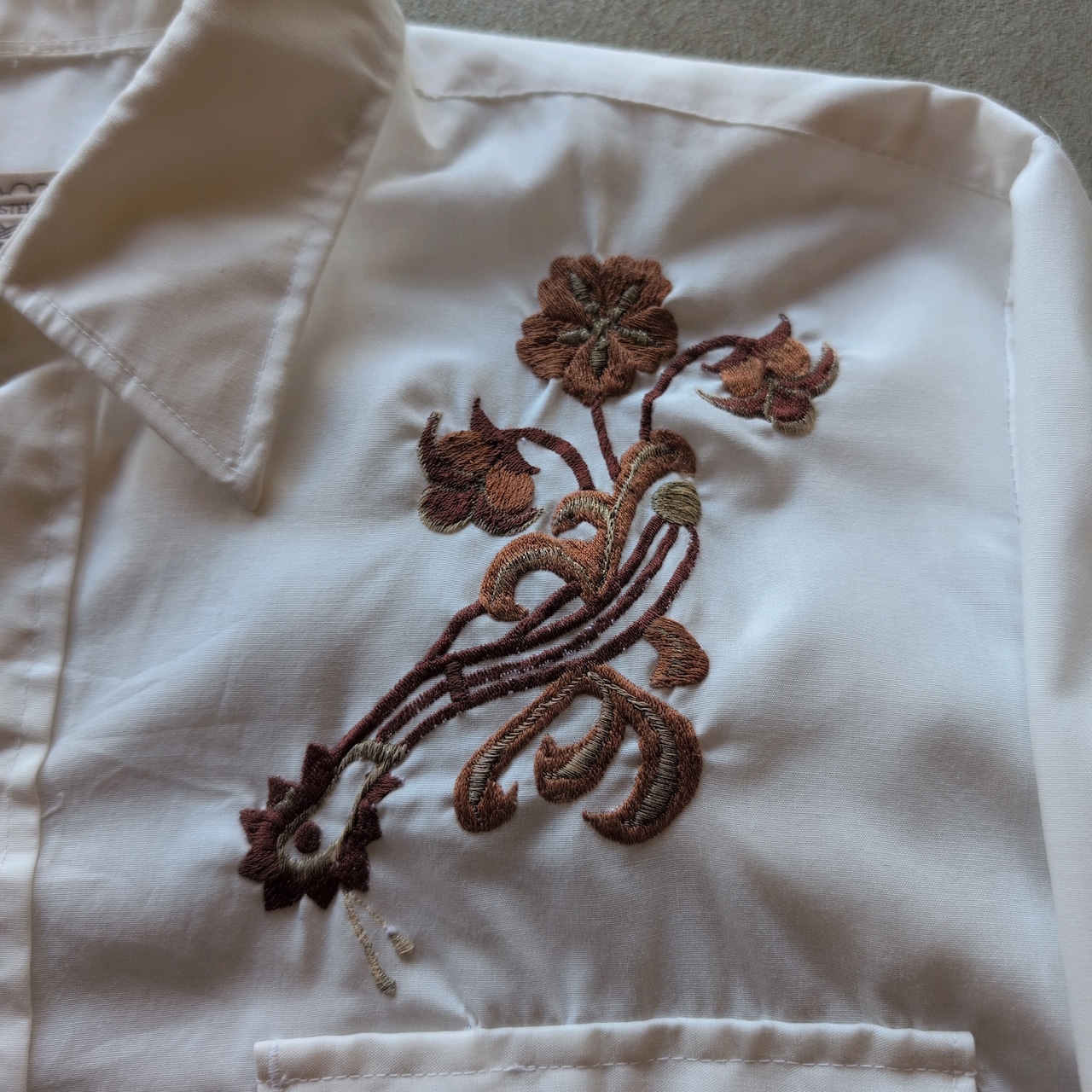 白をベースにフロントの両肩下に茶色っぽい刺繍が施されていたりポケットが三日月型のカーブをえがいていたりウエスタンシャツの象徴的な1枚です