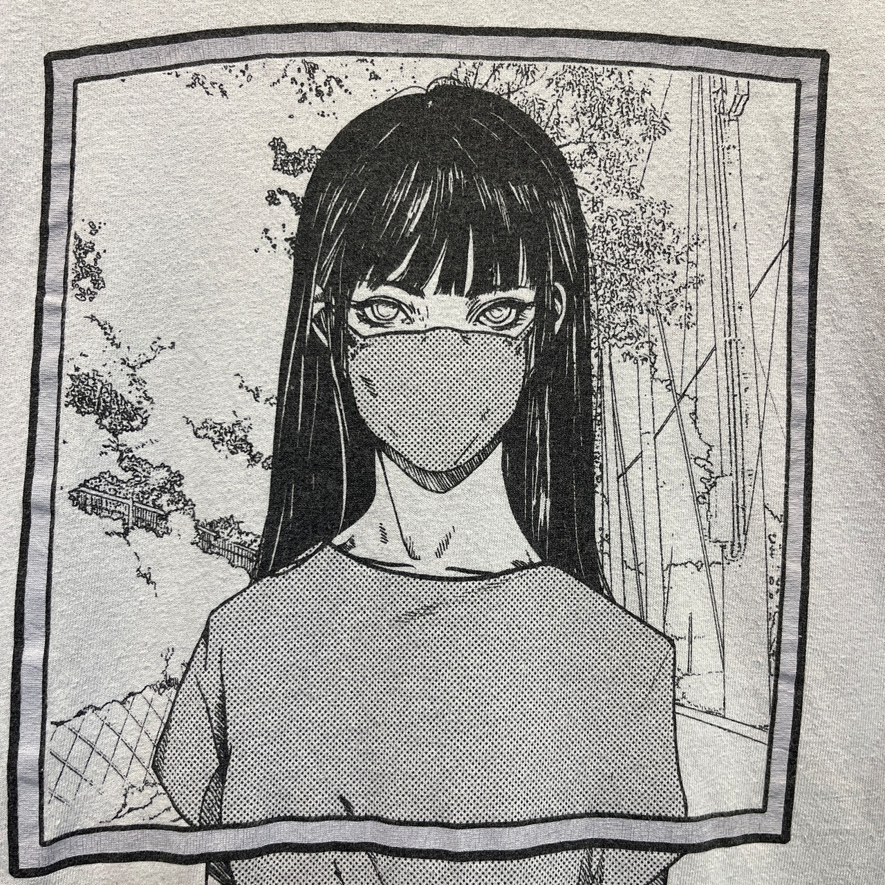 漫画タッチのマスクをした美女のプリントTシャツです