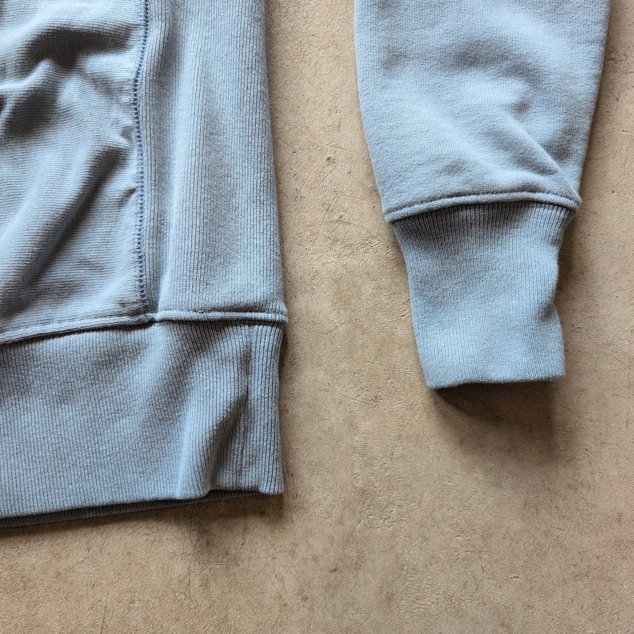 水色が褪せたような色がベースの生地に胸元と腕にそれぞれロゴが刺繍されています