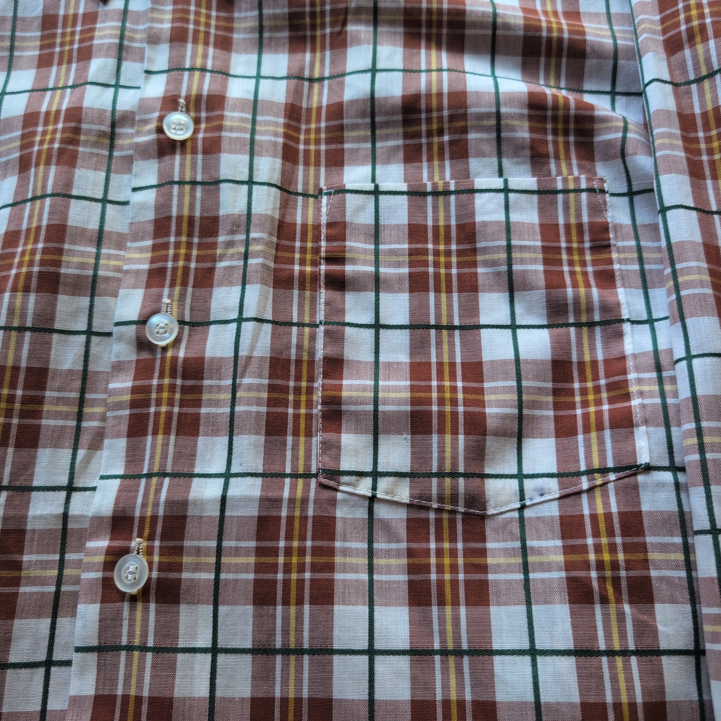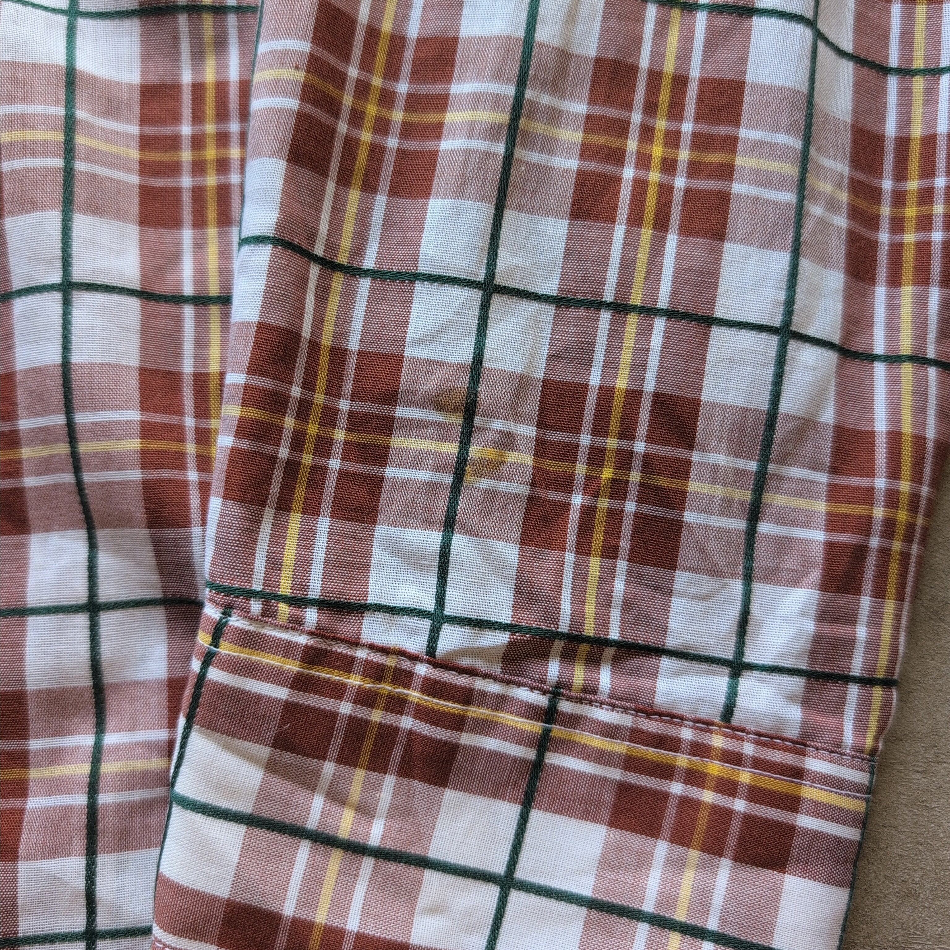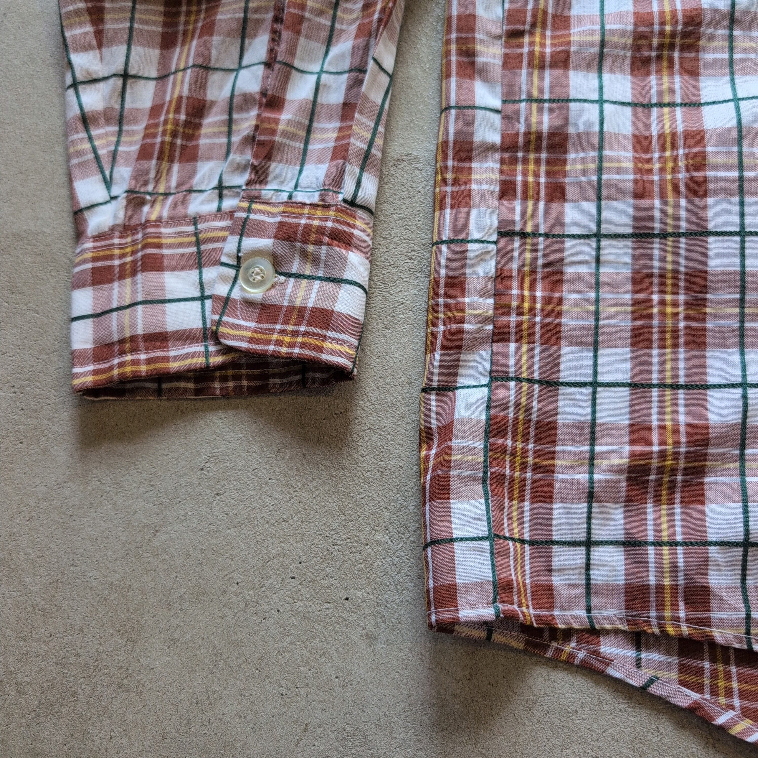 赤ぽい色を基調としたチェック柄に緑色の太めのラインが特徴的で、当時のアメカジスタイルを感じさせるような1枚です