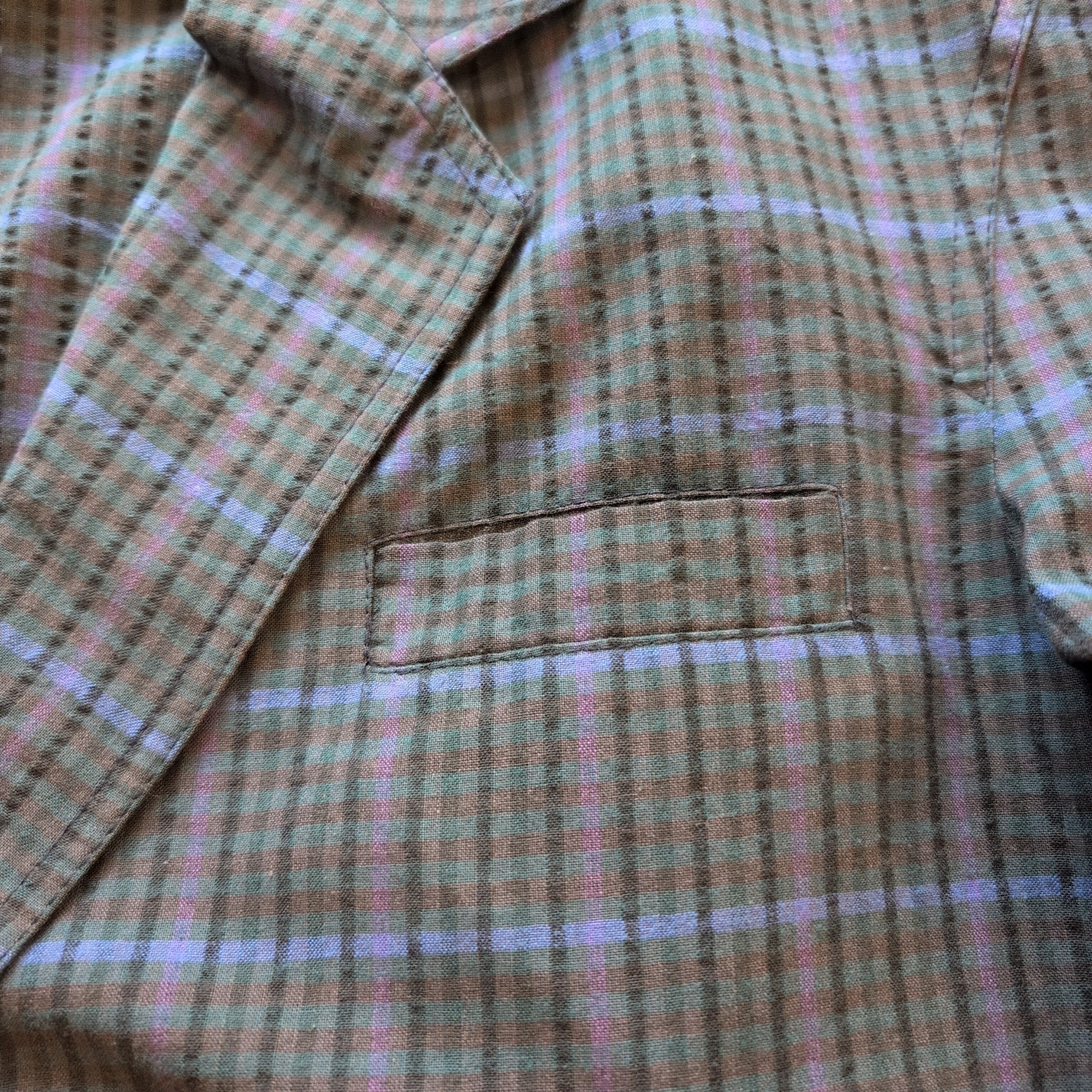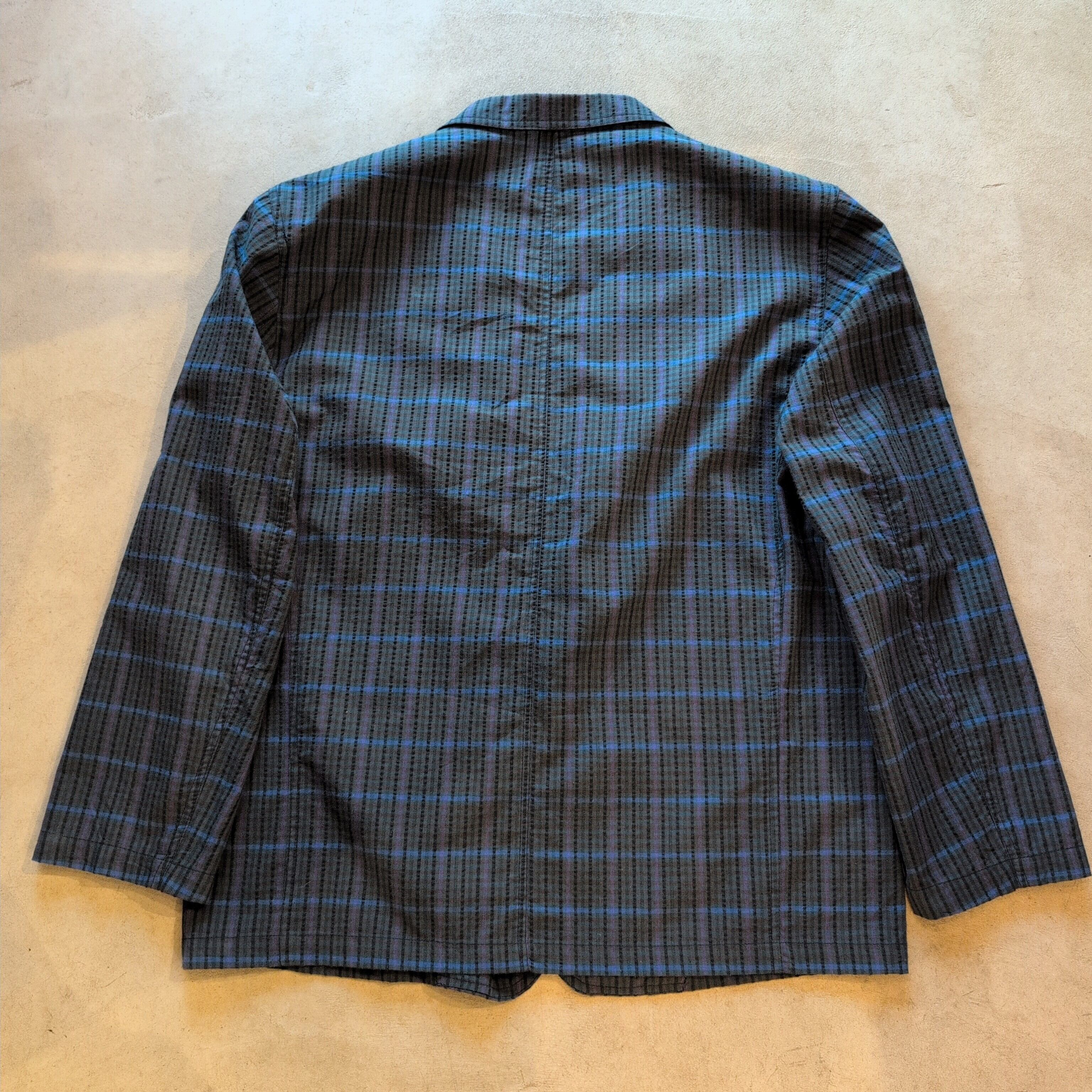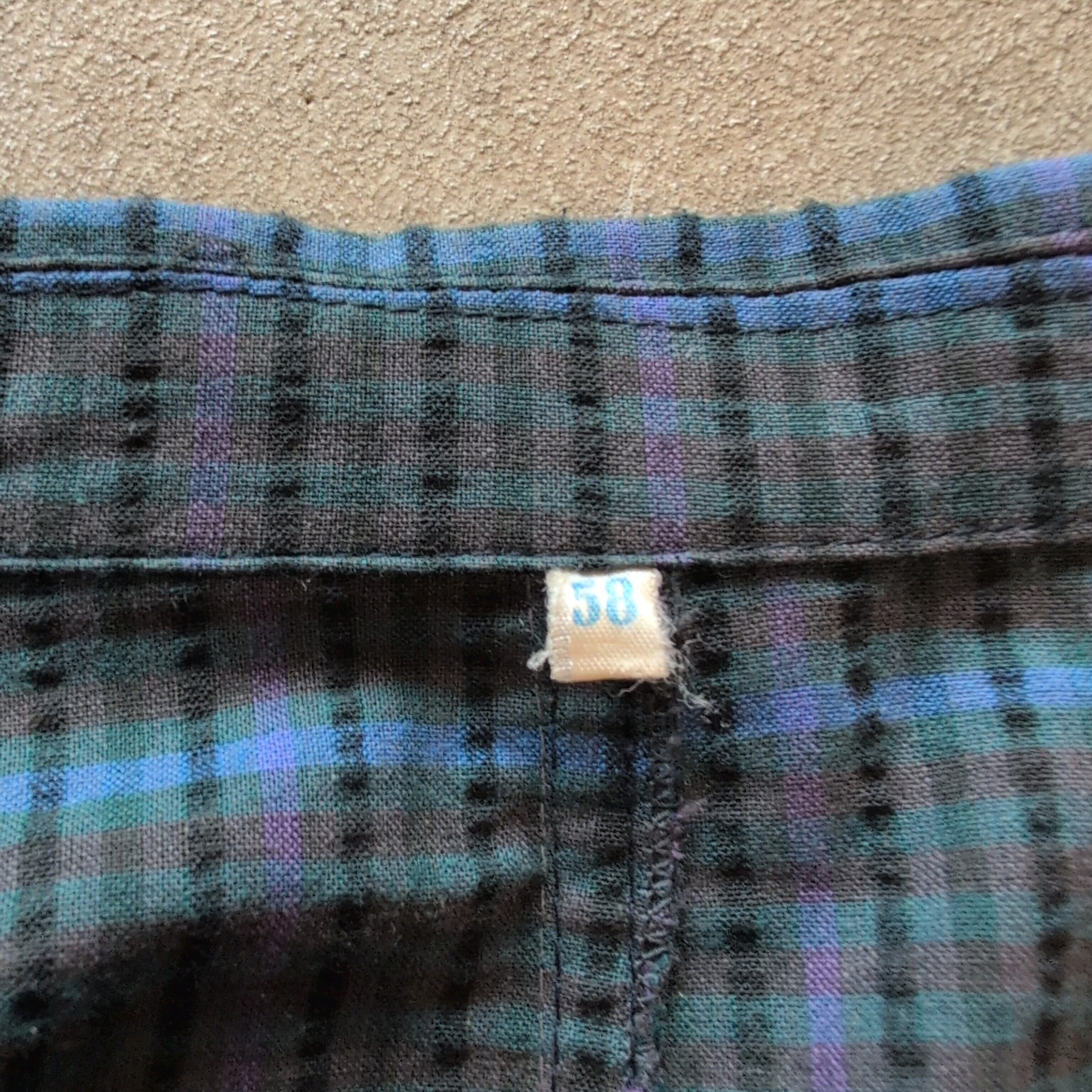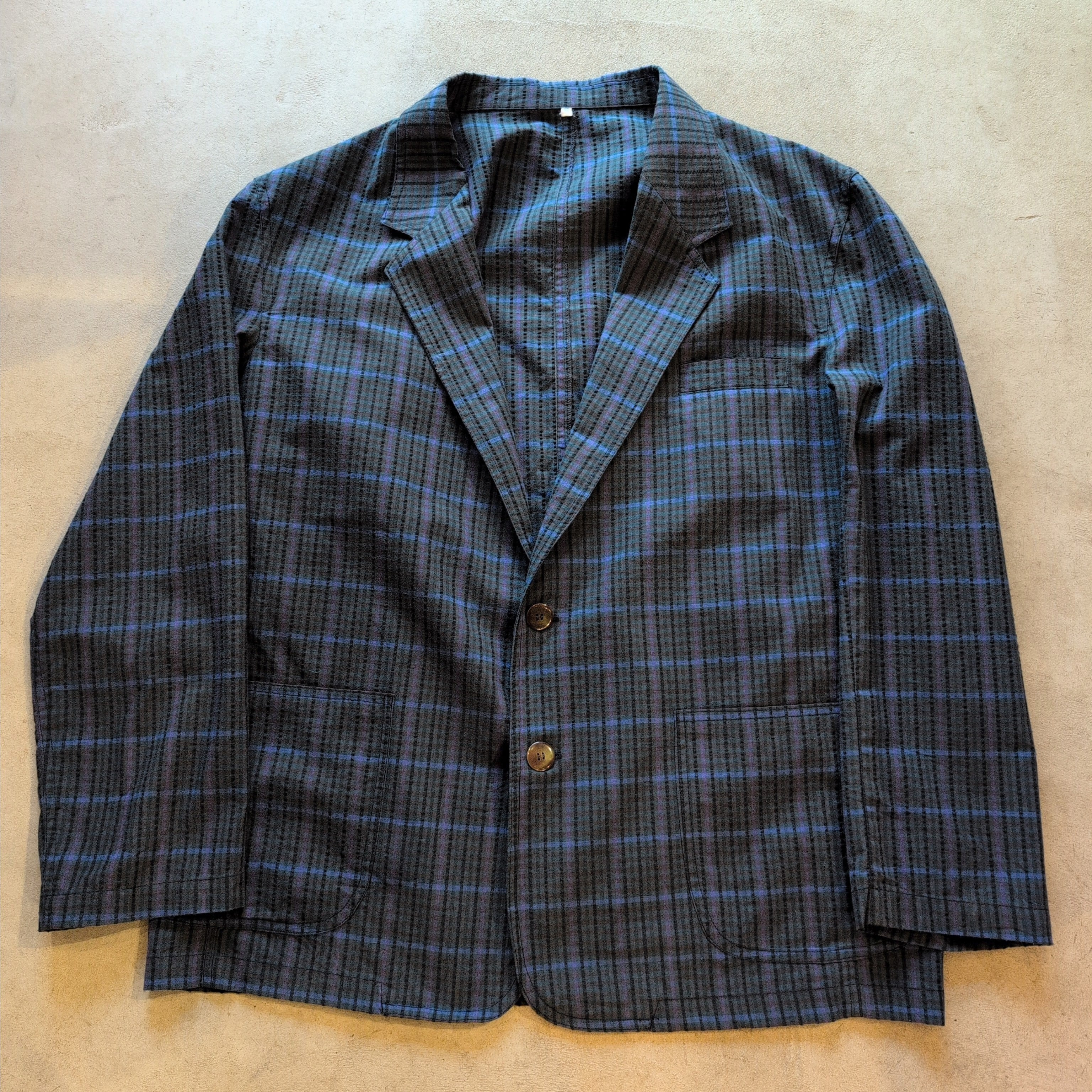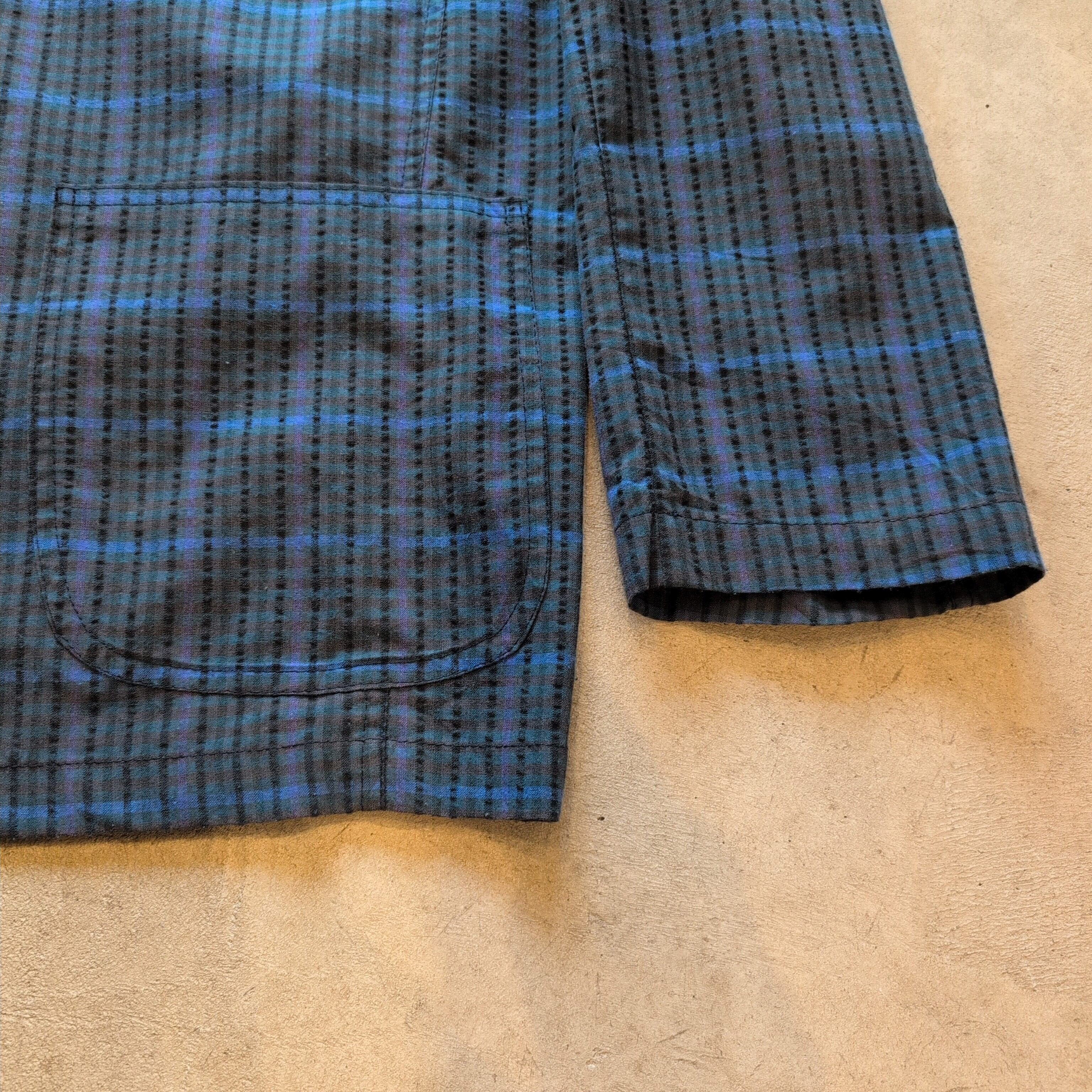 紺色ぽい生地をベースに、紫や青、黒などの暗めの色でチェック柄が描かれています