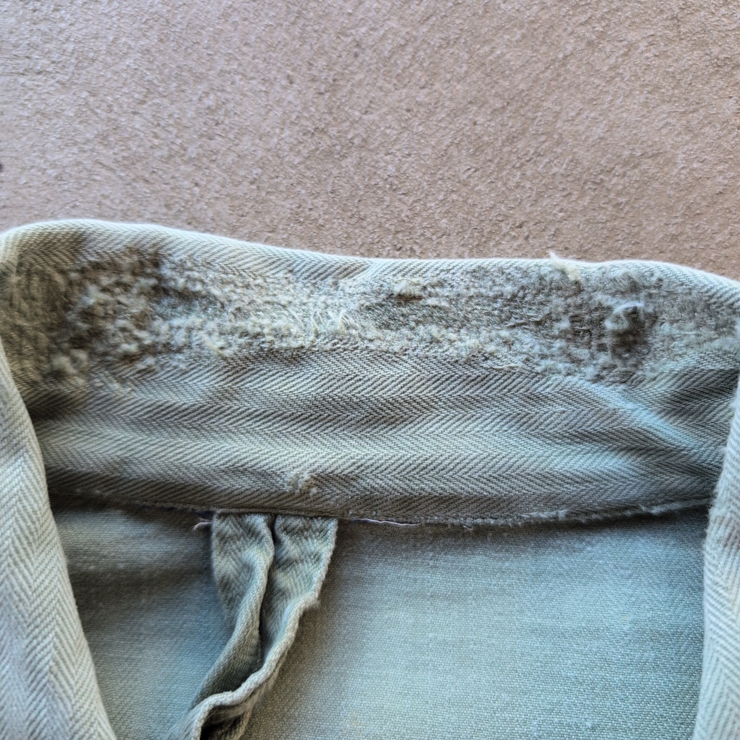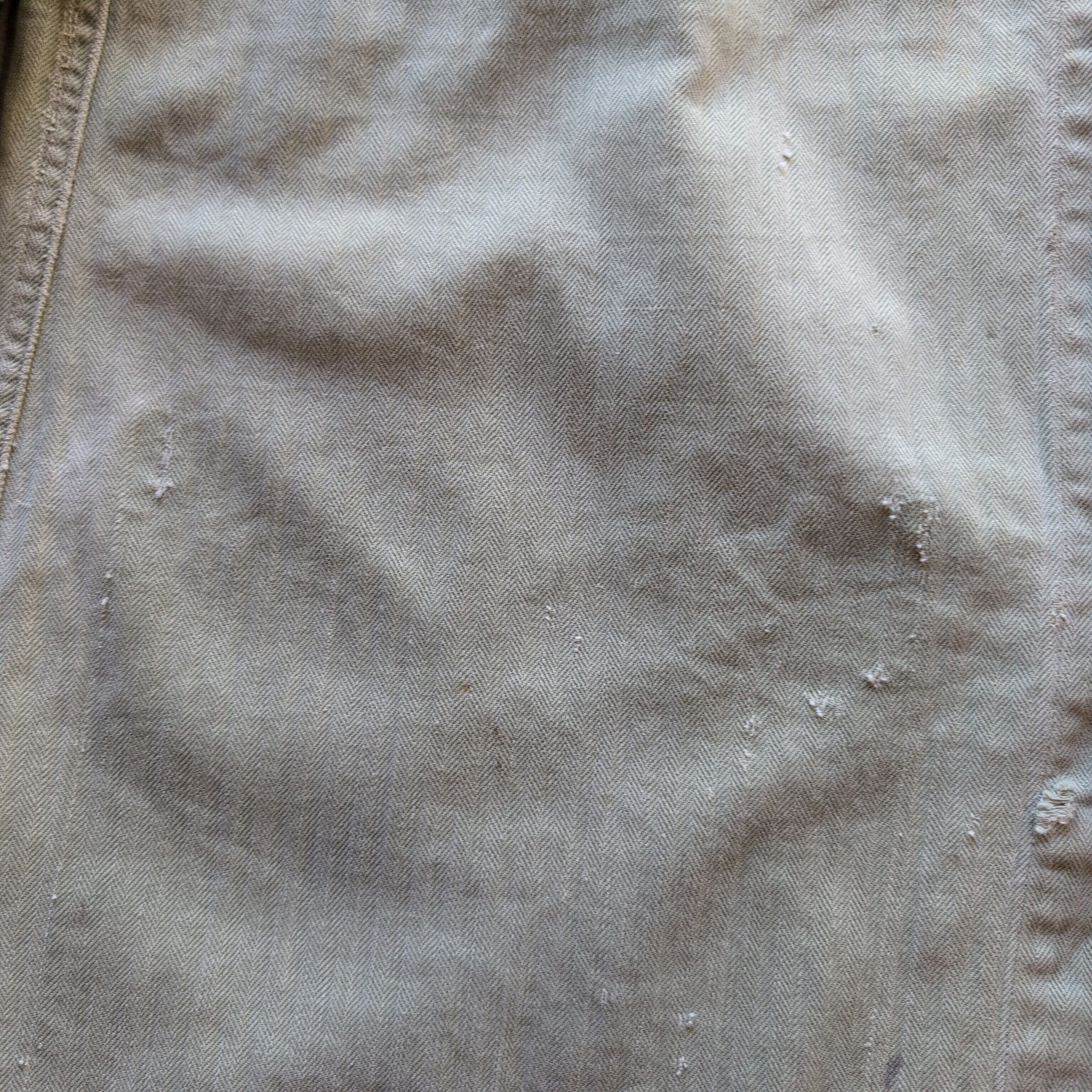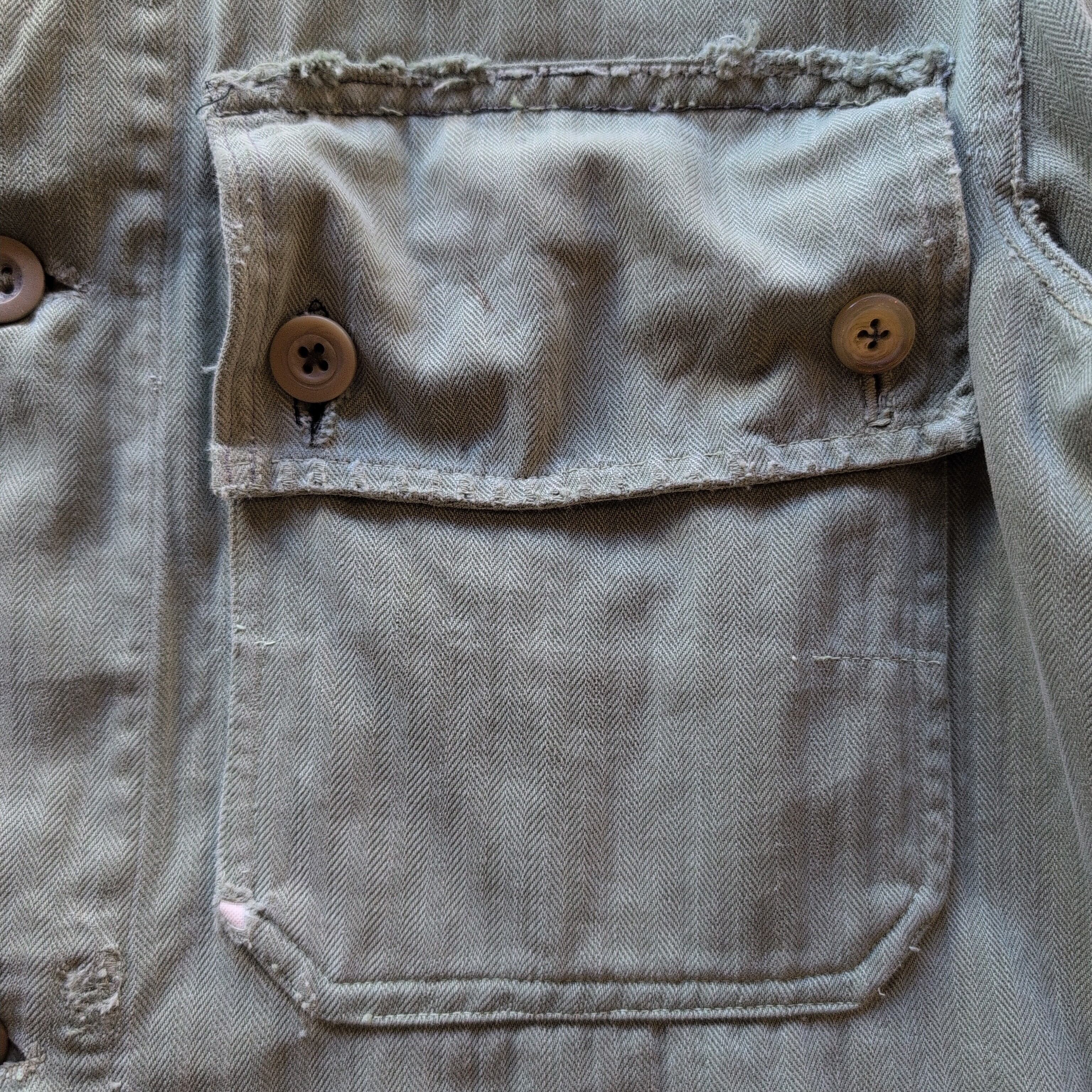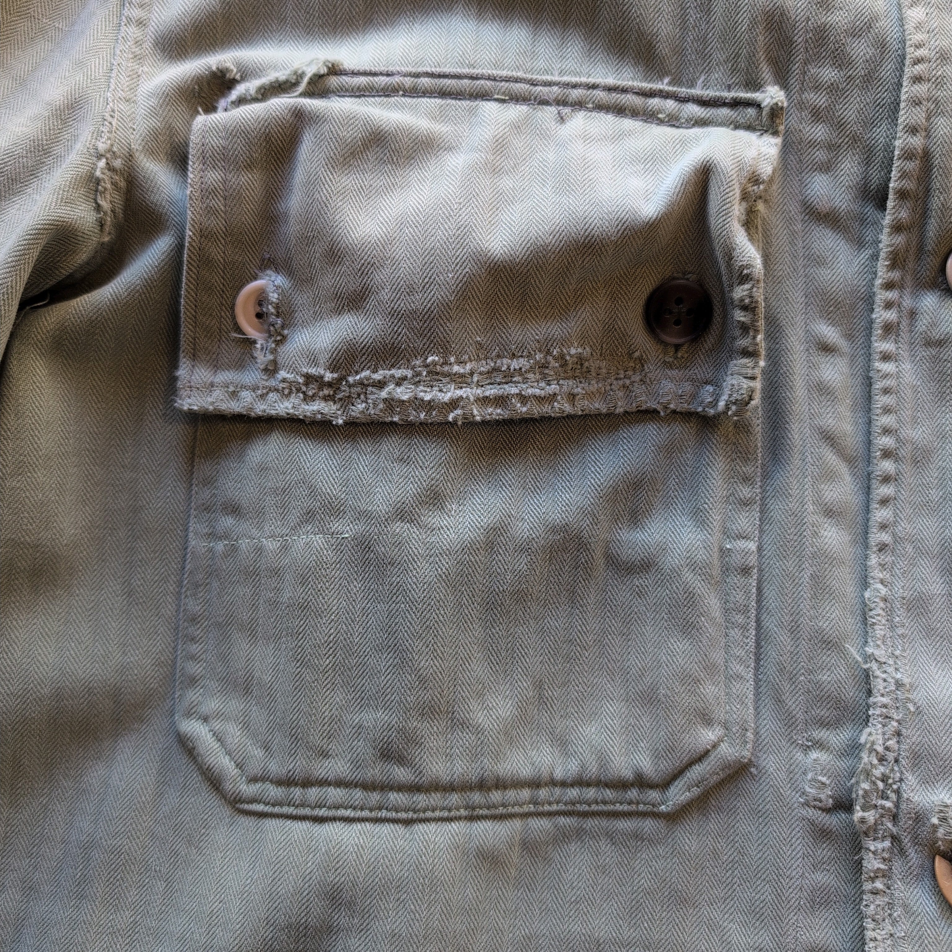 ミリタリージャケットぽい形と、ダメージや汚れが相まってヴィンテージ感の漂う1枚です