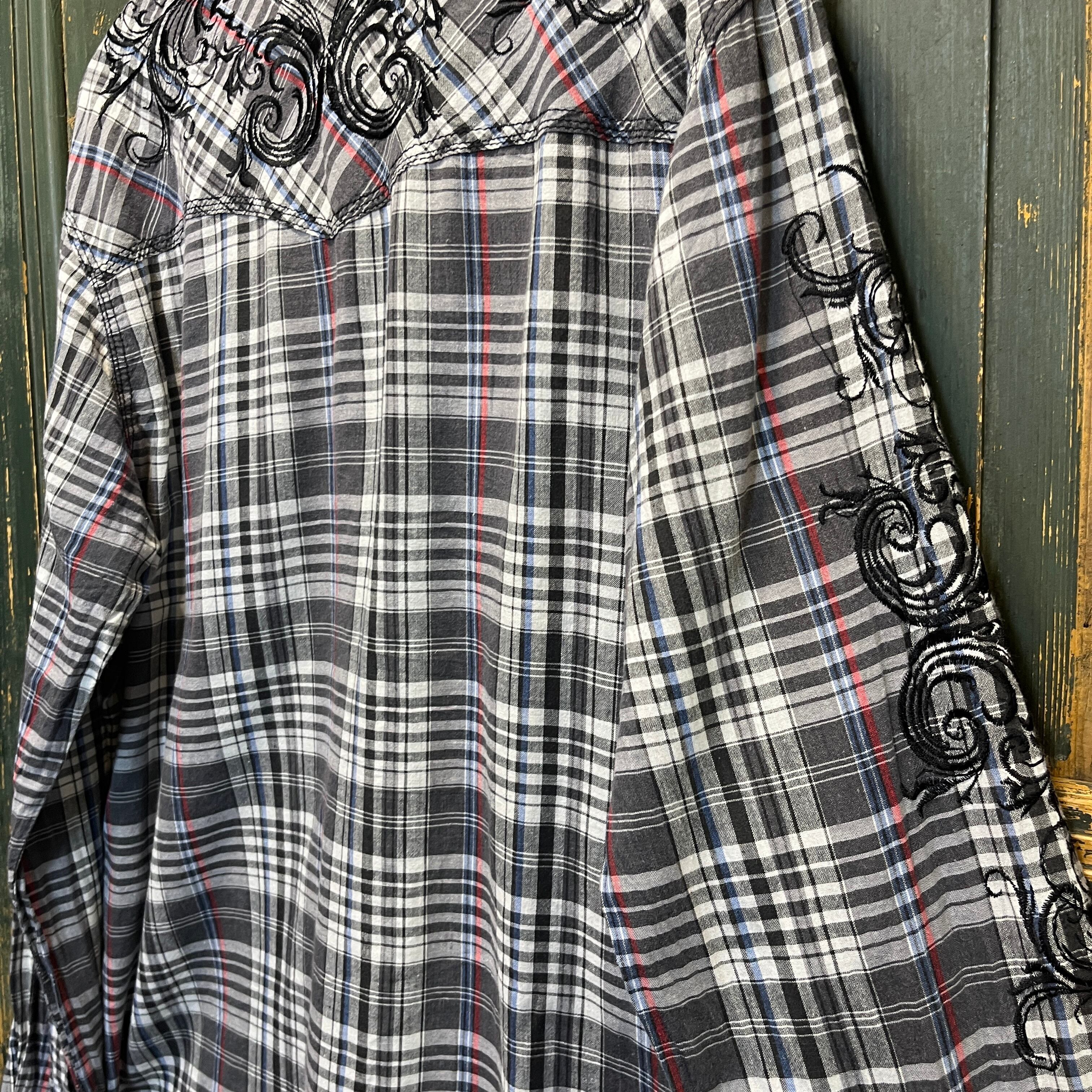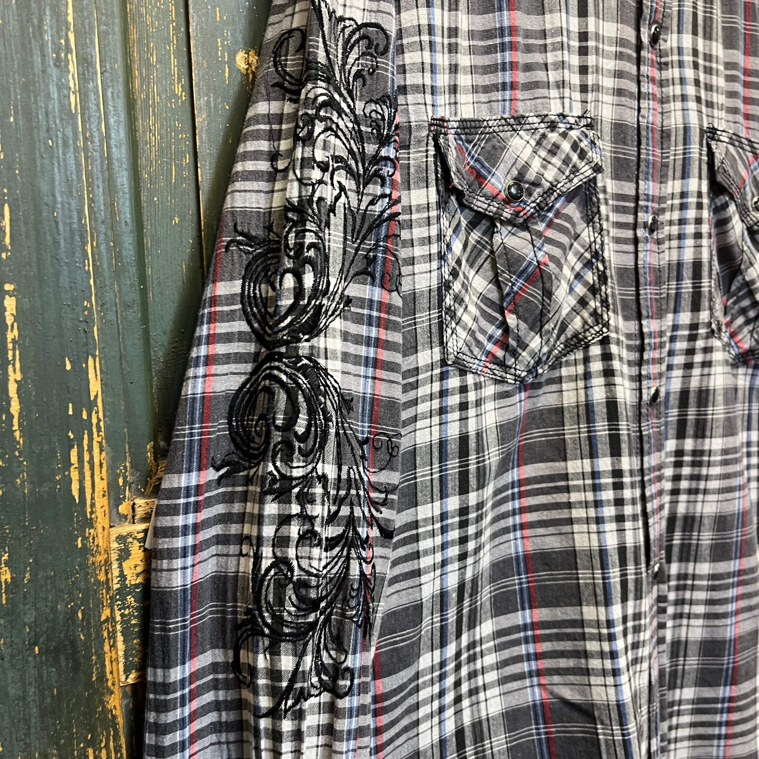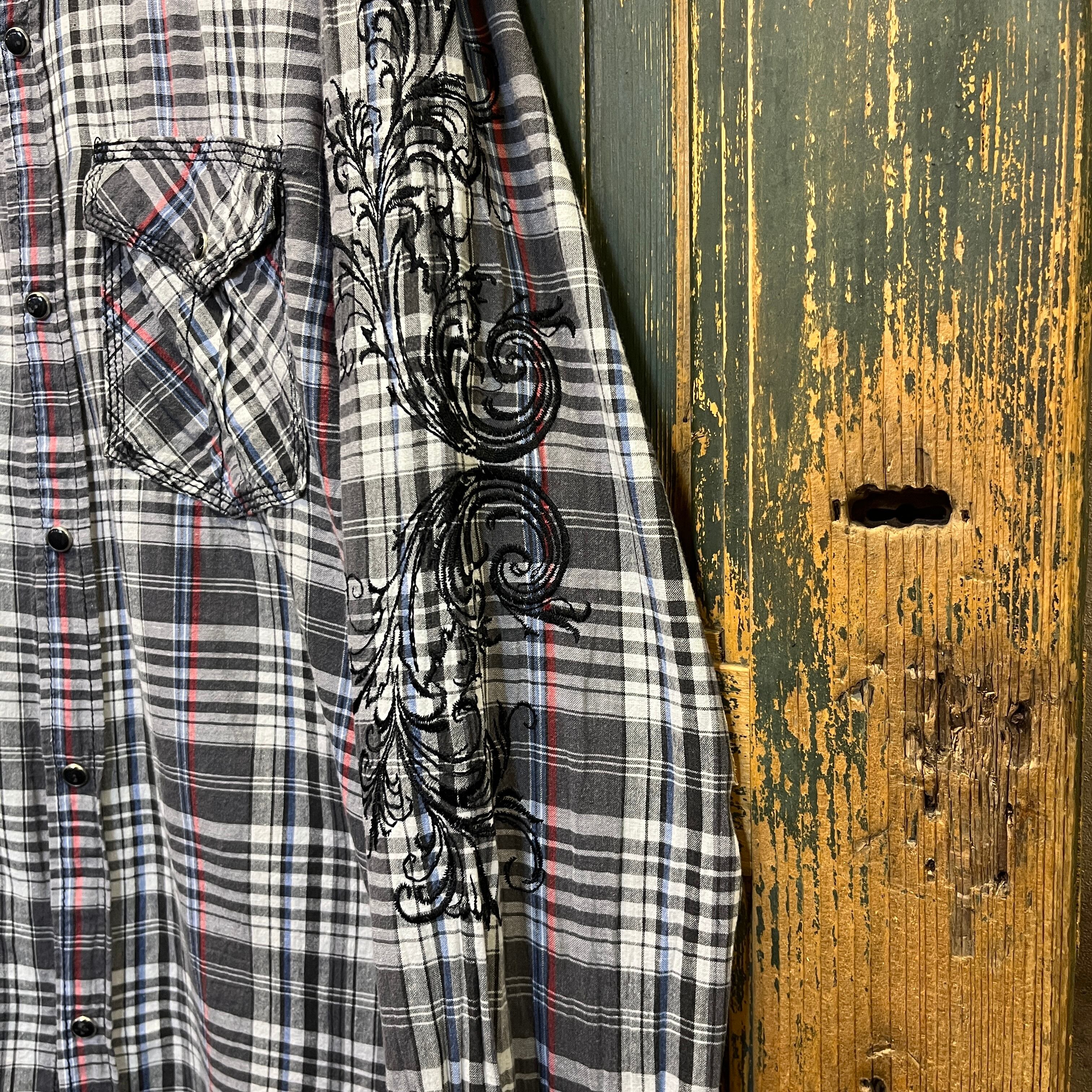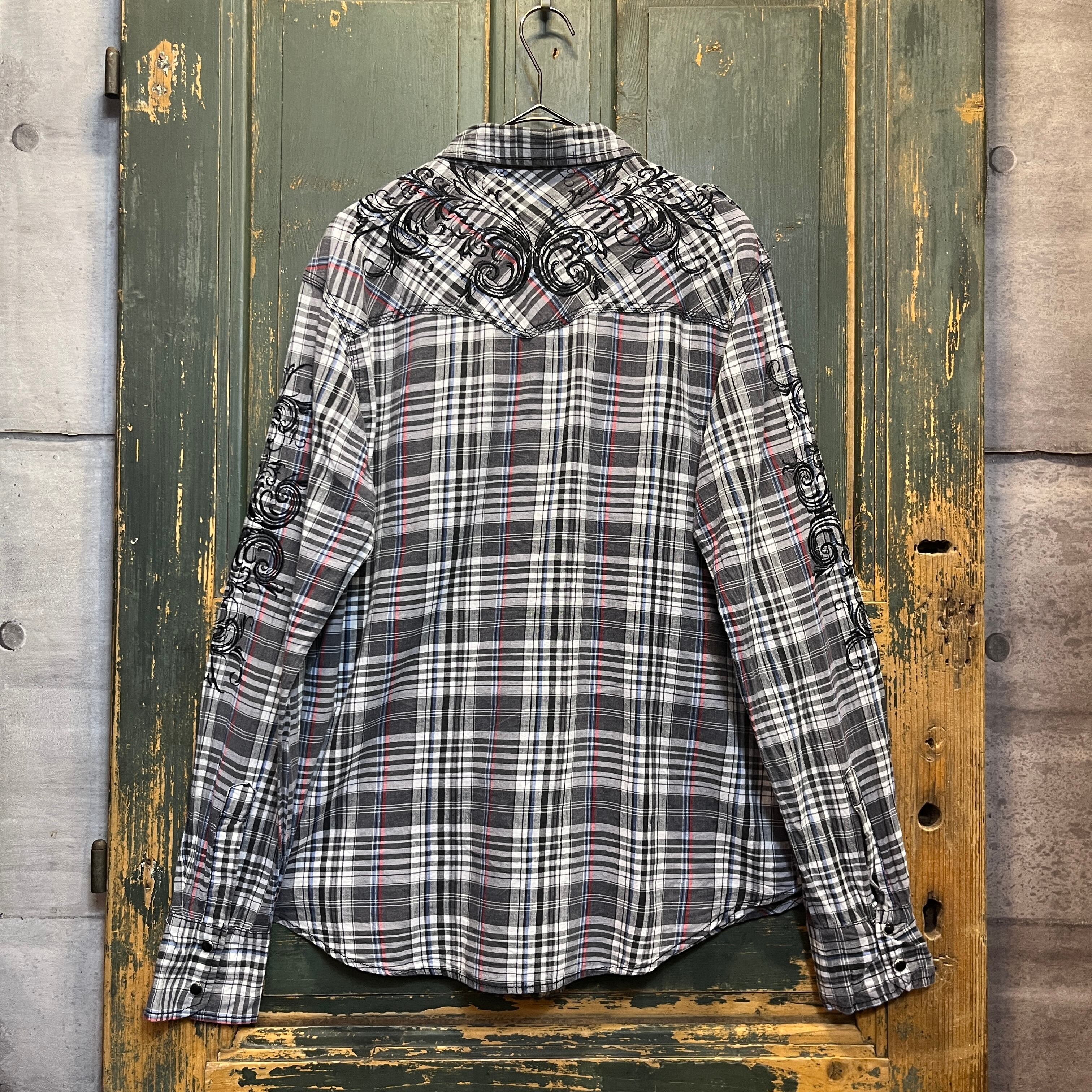 両袖と背面に刺繍が入ったチェックのウエスタンシャツです