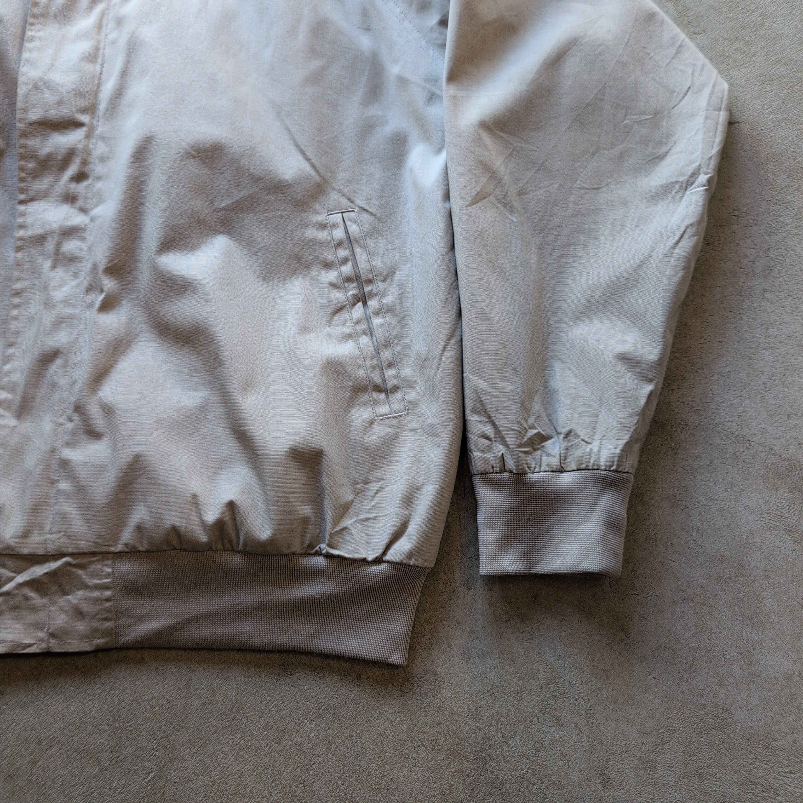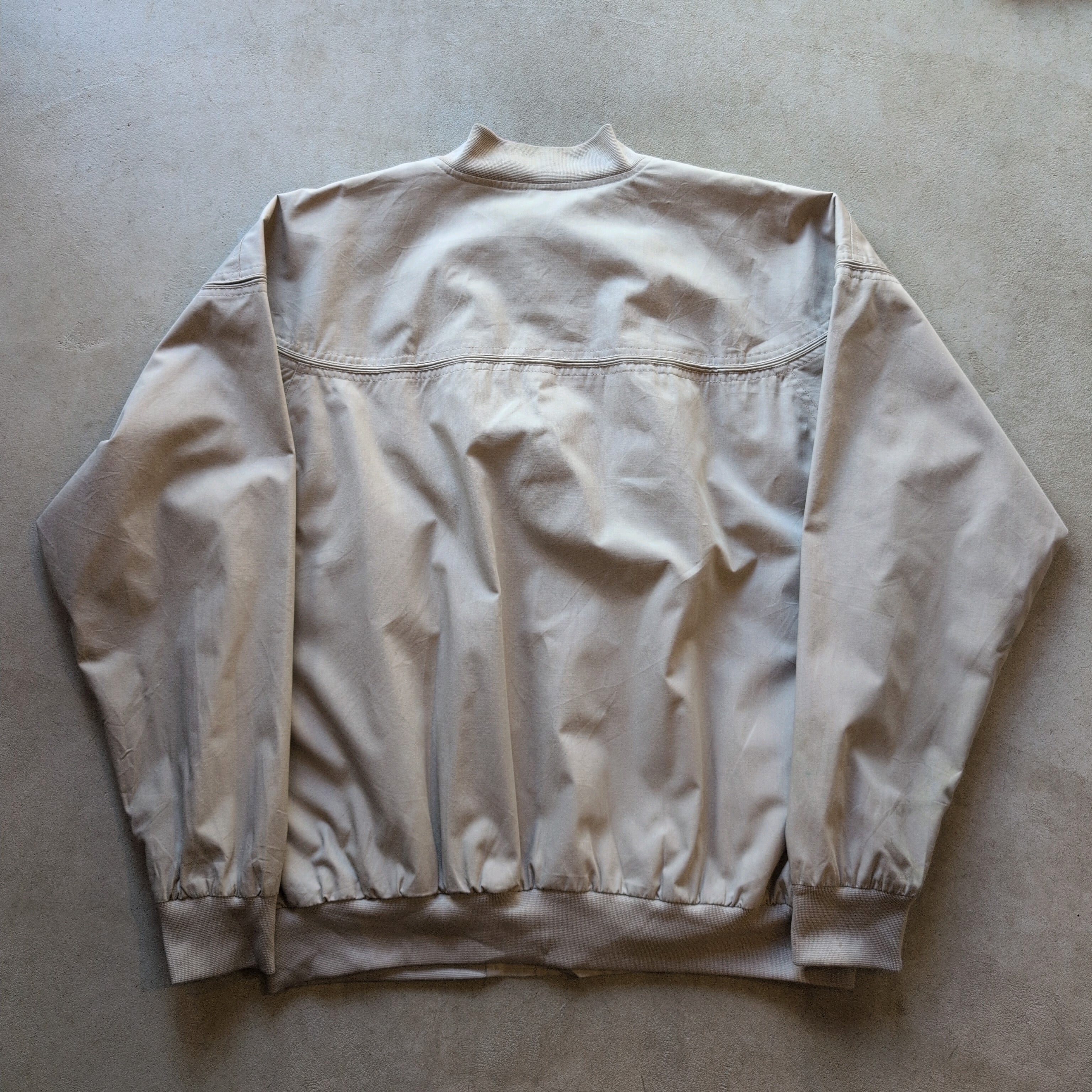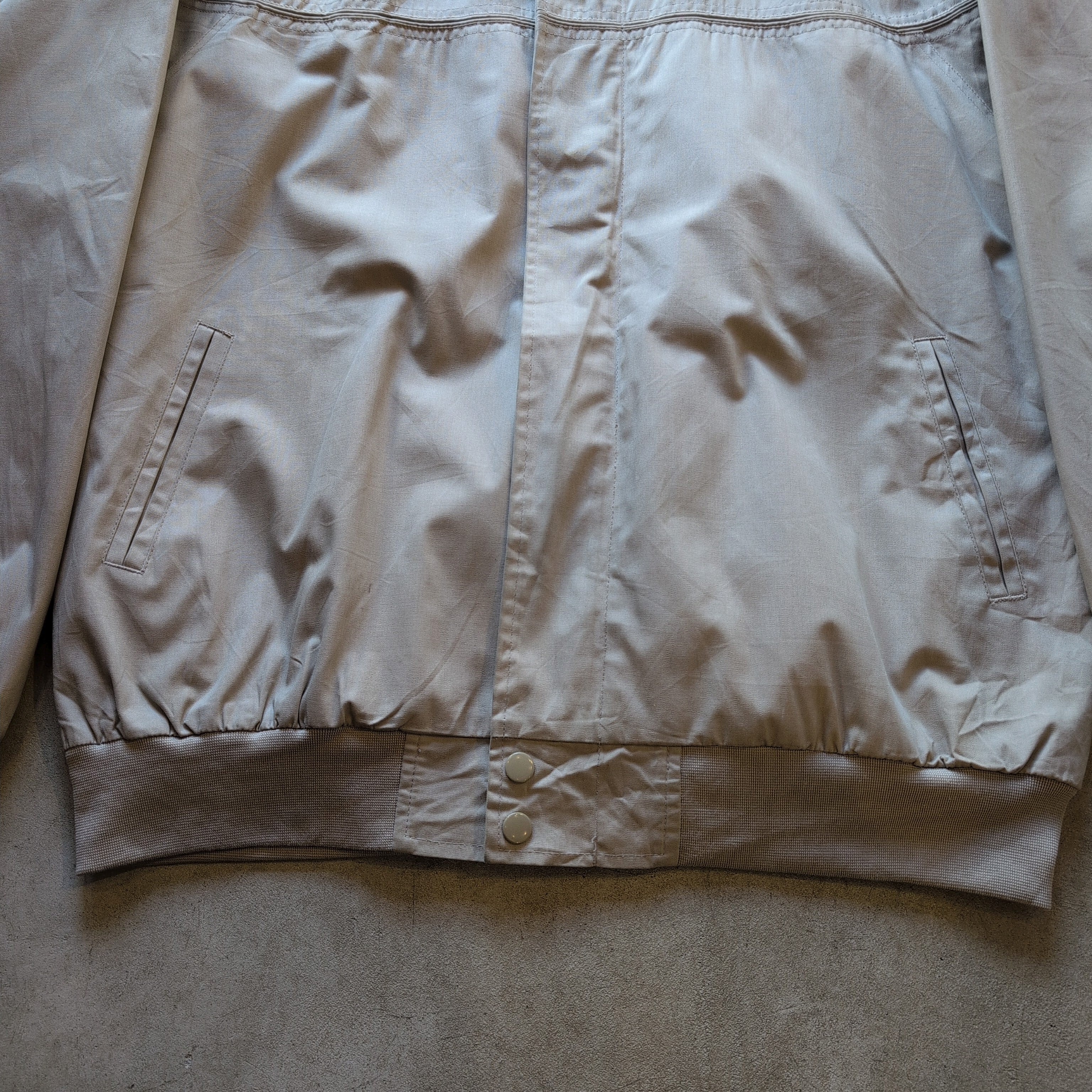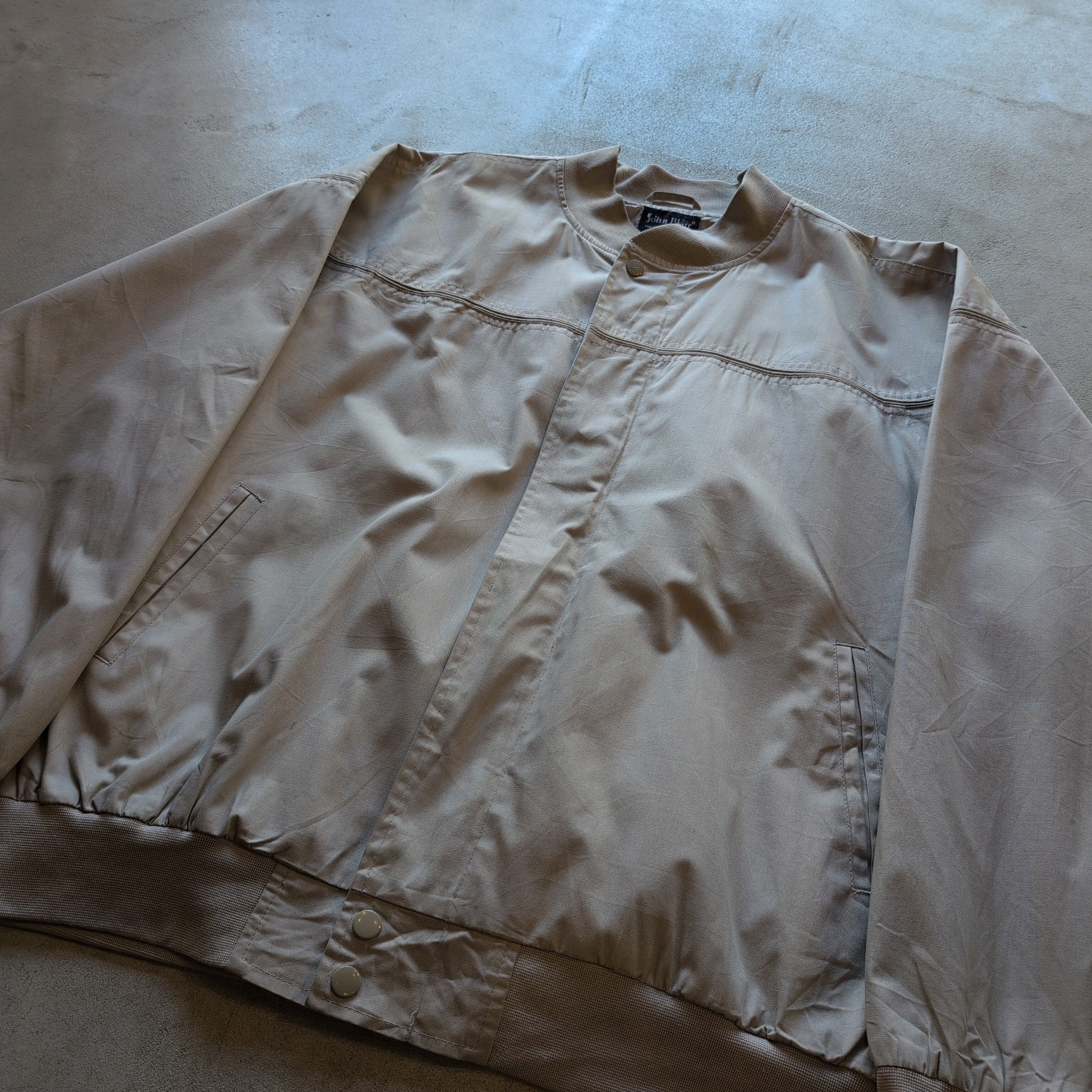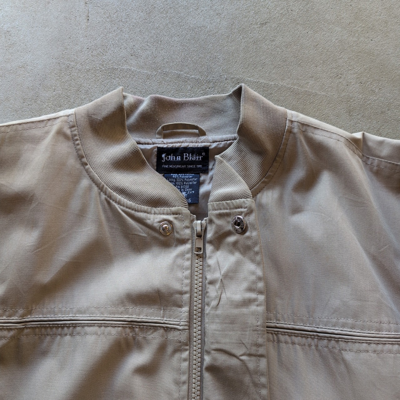 襟付きのシンプルなデザインでジッパーとボタンの二重留め、両サイドにポケットと袖口と裾はリブ仕様になっている1枚です