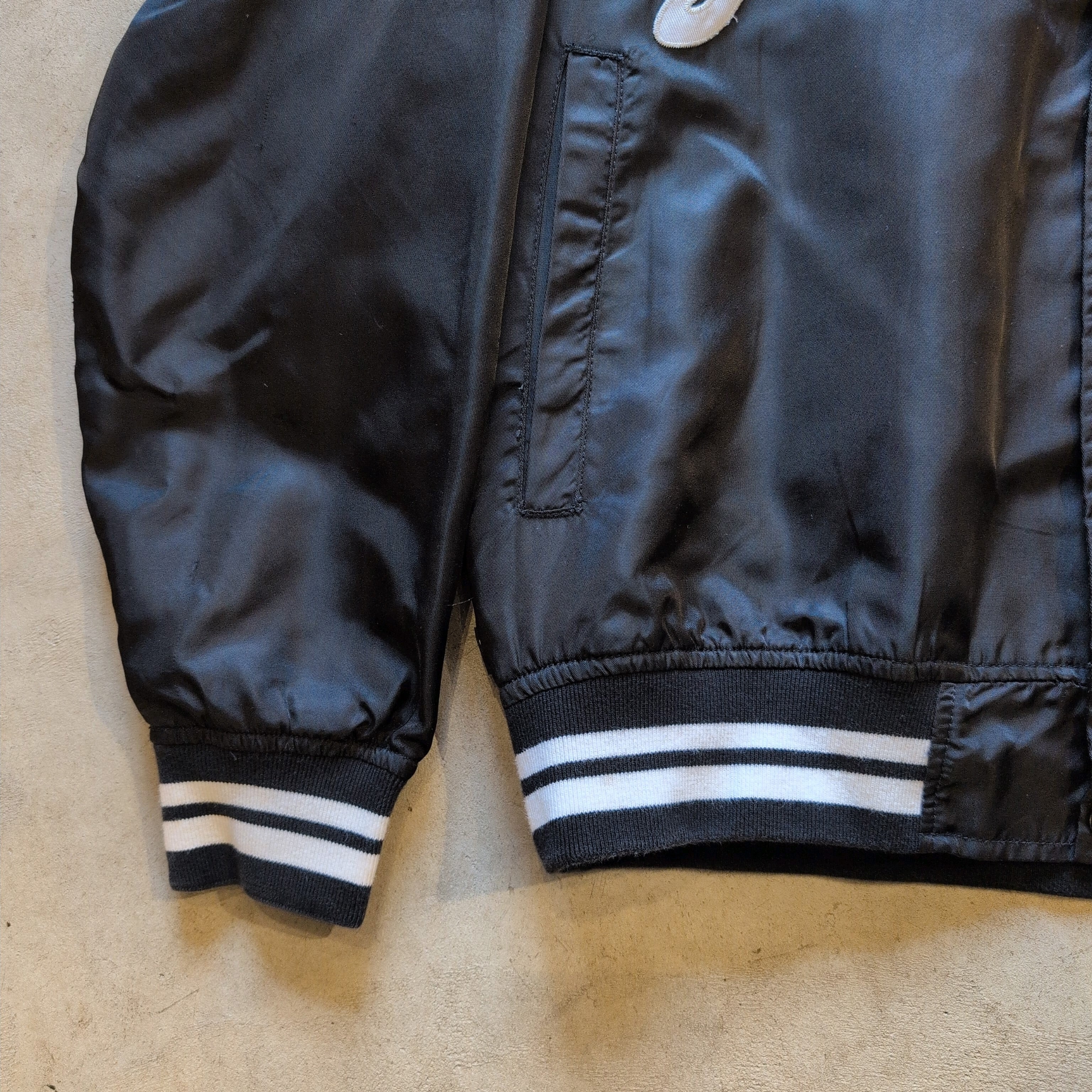 光沢感のあるブラックボディに襟、袖口、裾の白のリブラインが魅力的なジャケットです