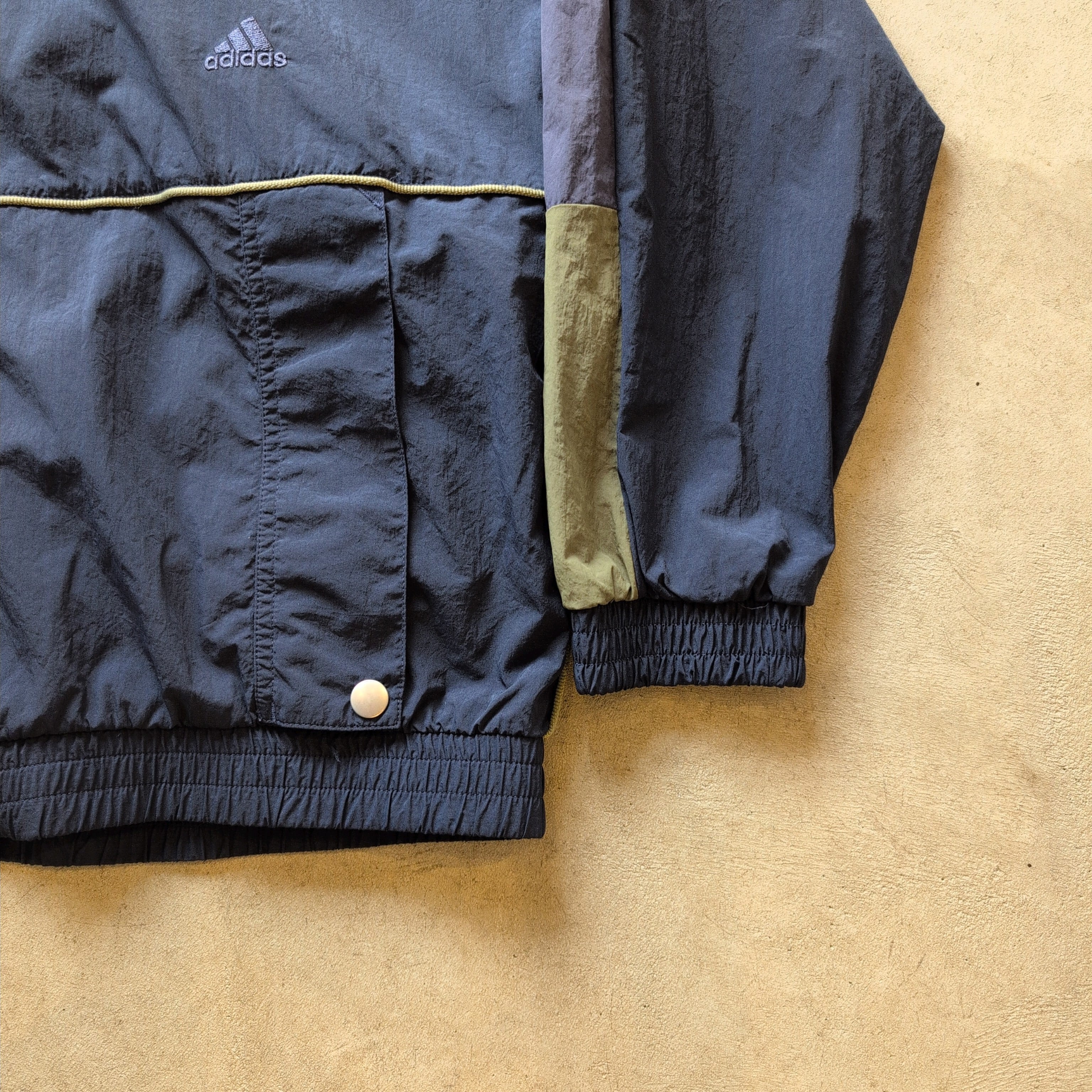 アディダスのネイビーカラーが基調のナイロンジャケットです