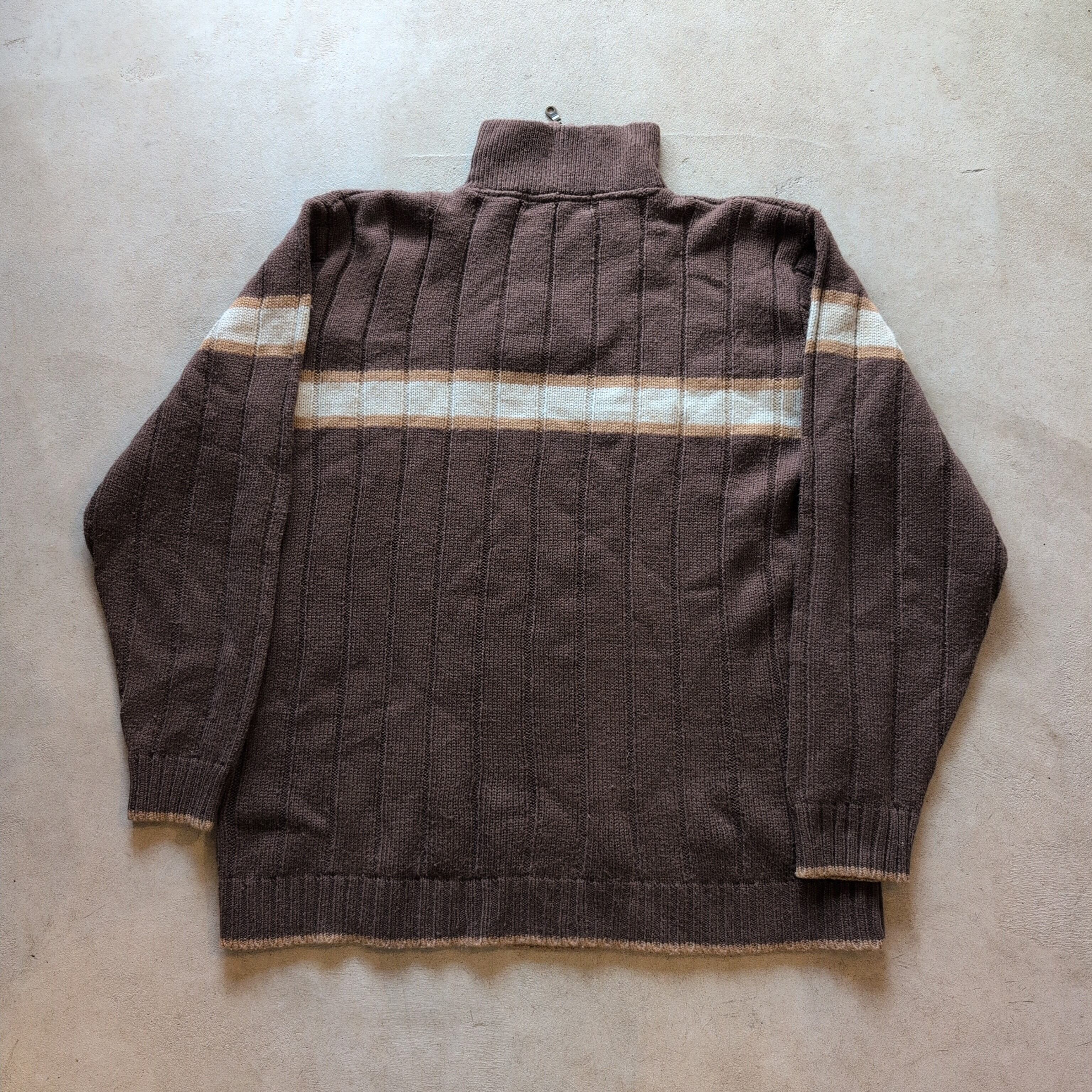 ブラウンを基調に、同系色でデザインされたボーダーが映えるニットです