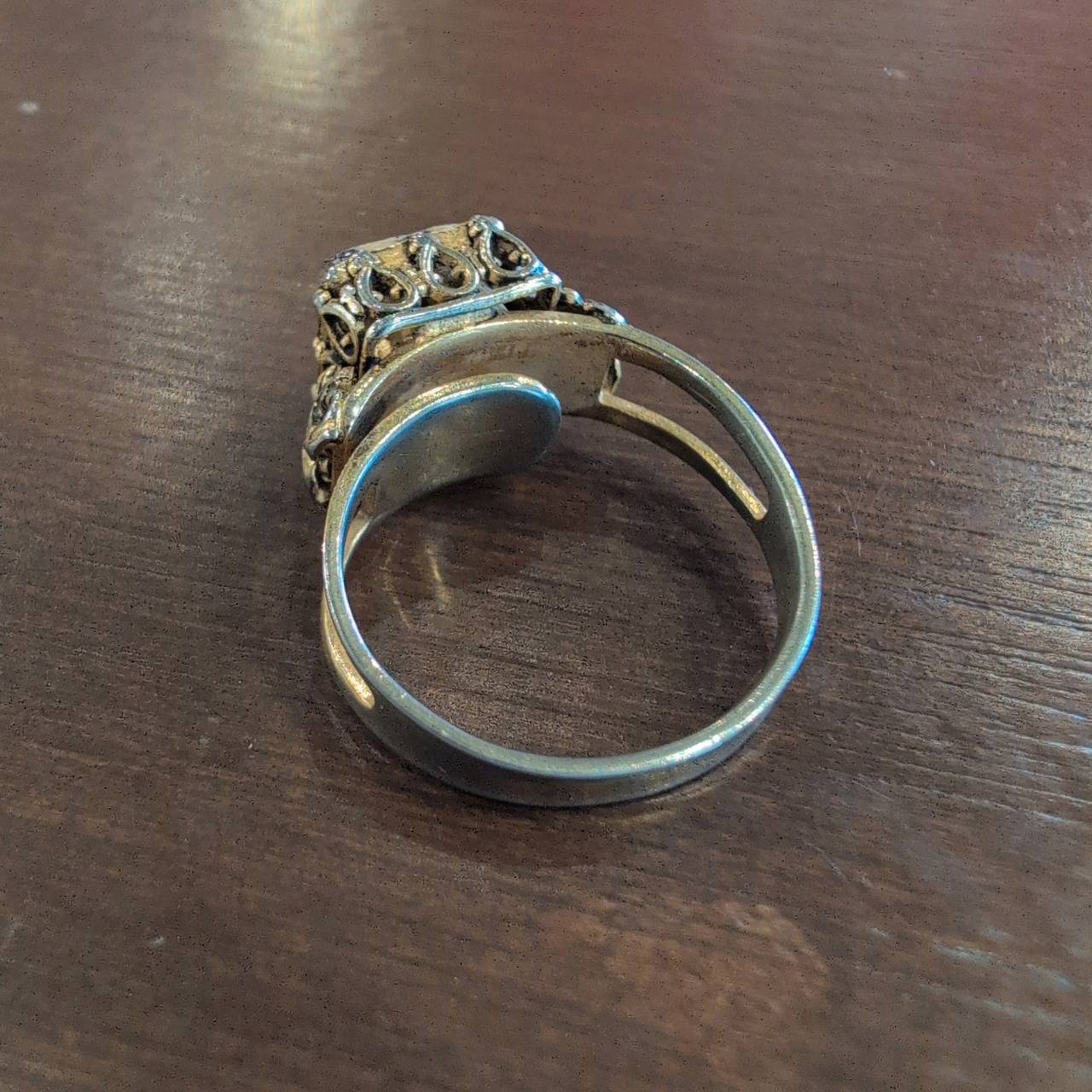 チェッカーボード柄の装飾が施された金色のリングです