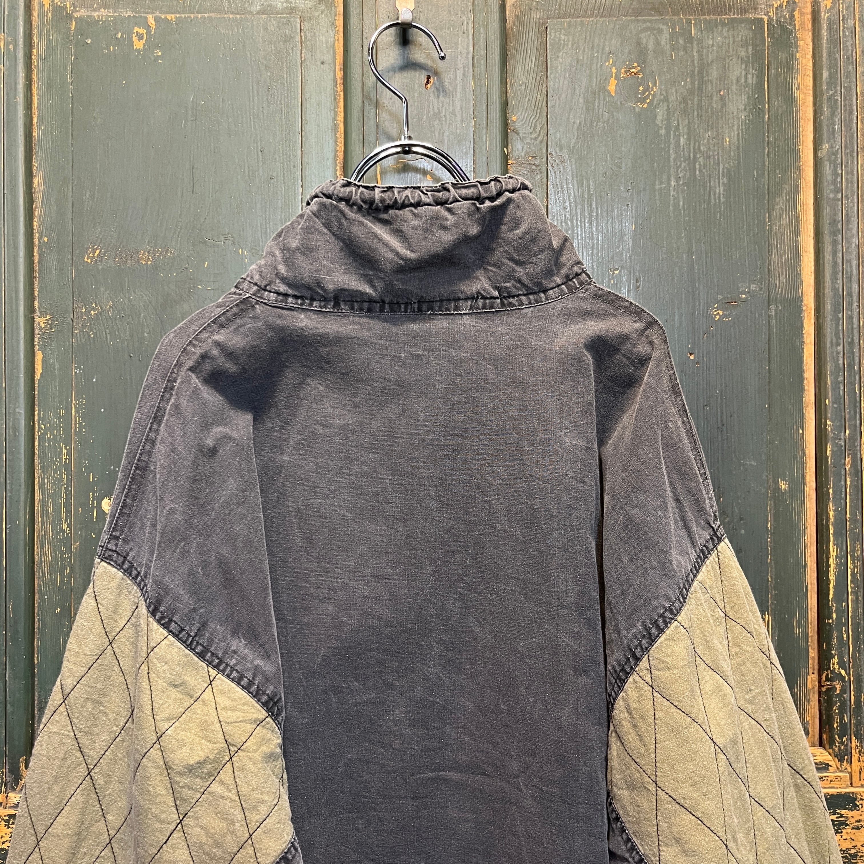 カーキ系とブラック系のツートーンのカラーのプルオーバータイプのトップスです