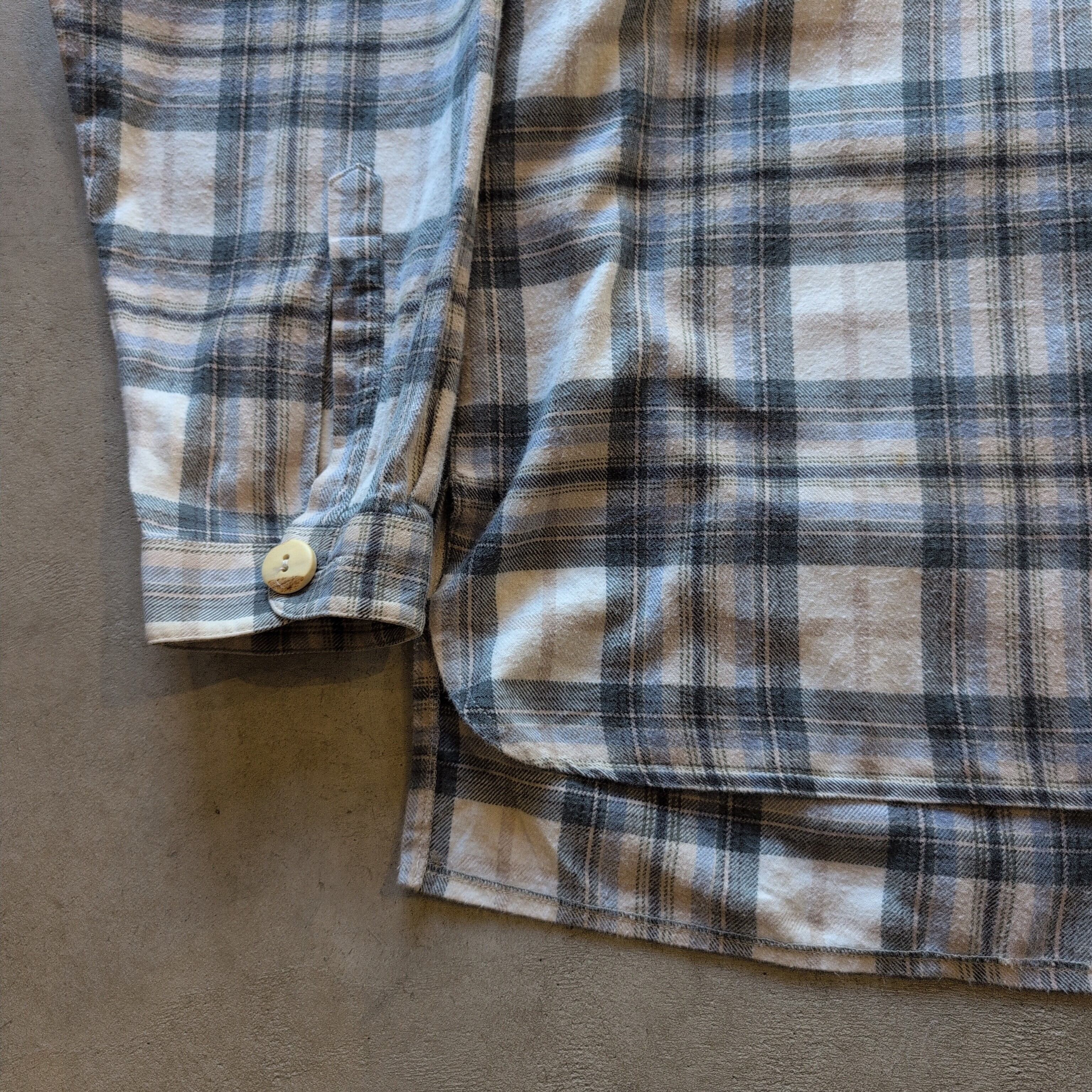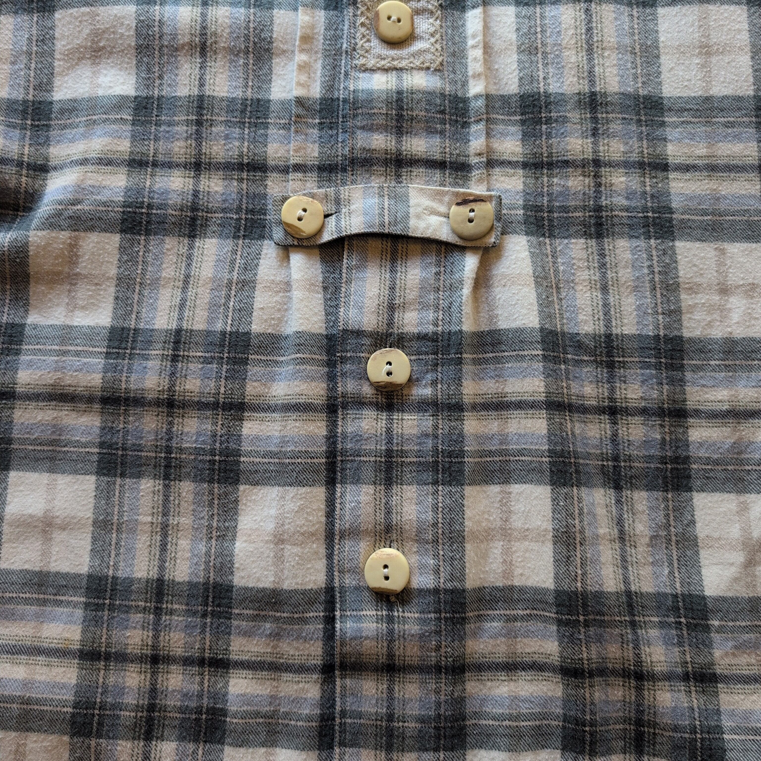 やさしい配色のチェックに、装飾のボタンがアクセントになっている1枚だと思います