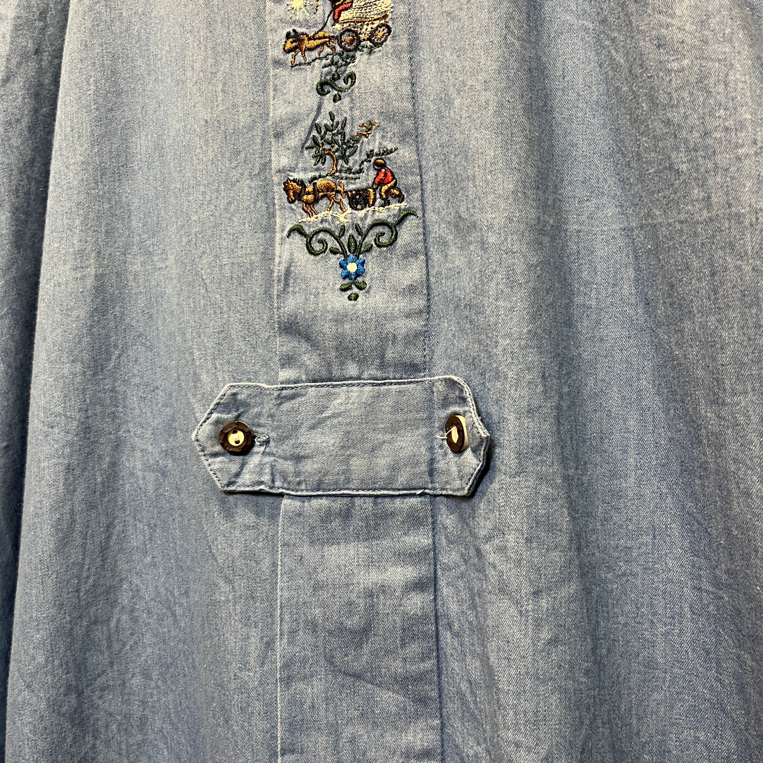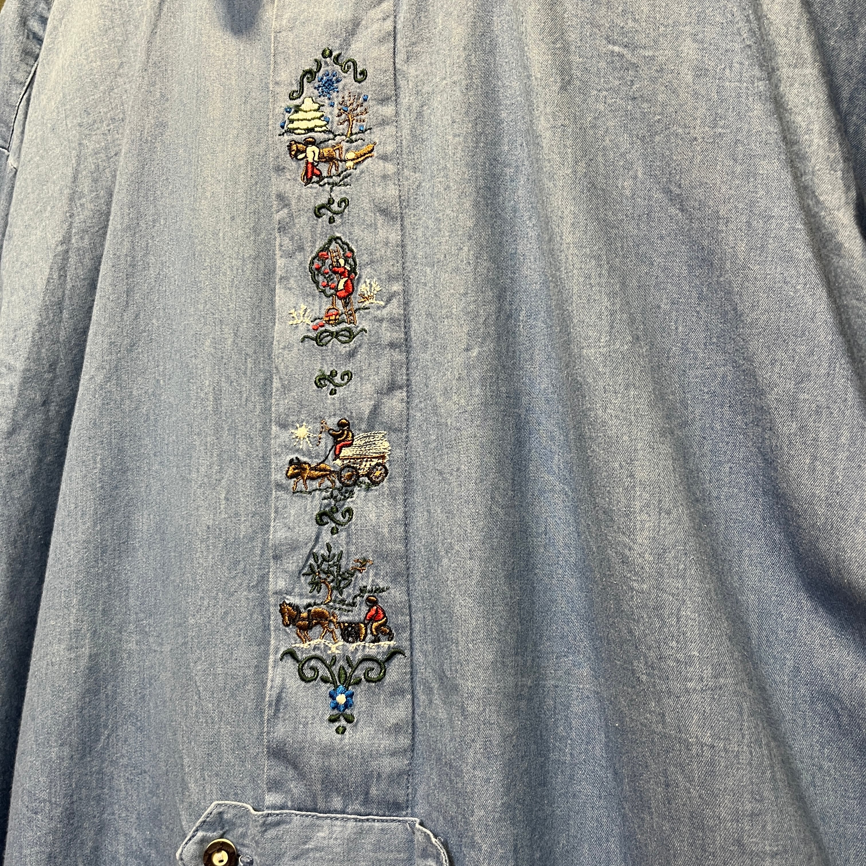 4段で人々の様子が刺繍されたチロリアンシャツです