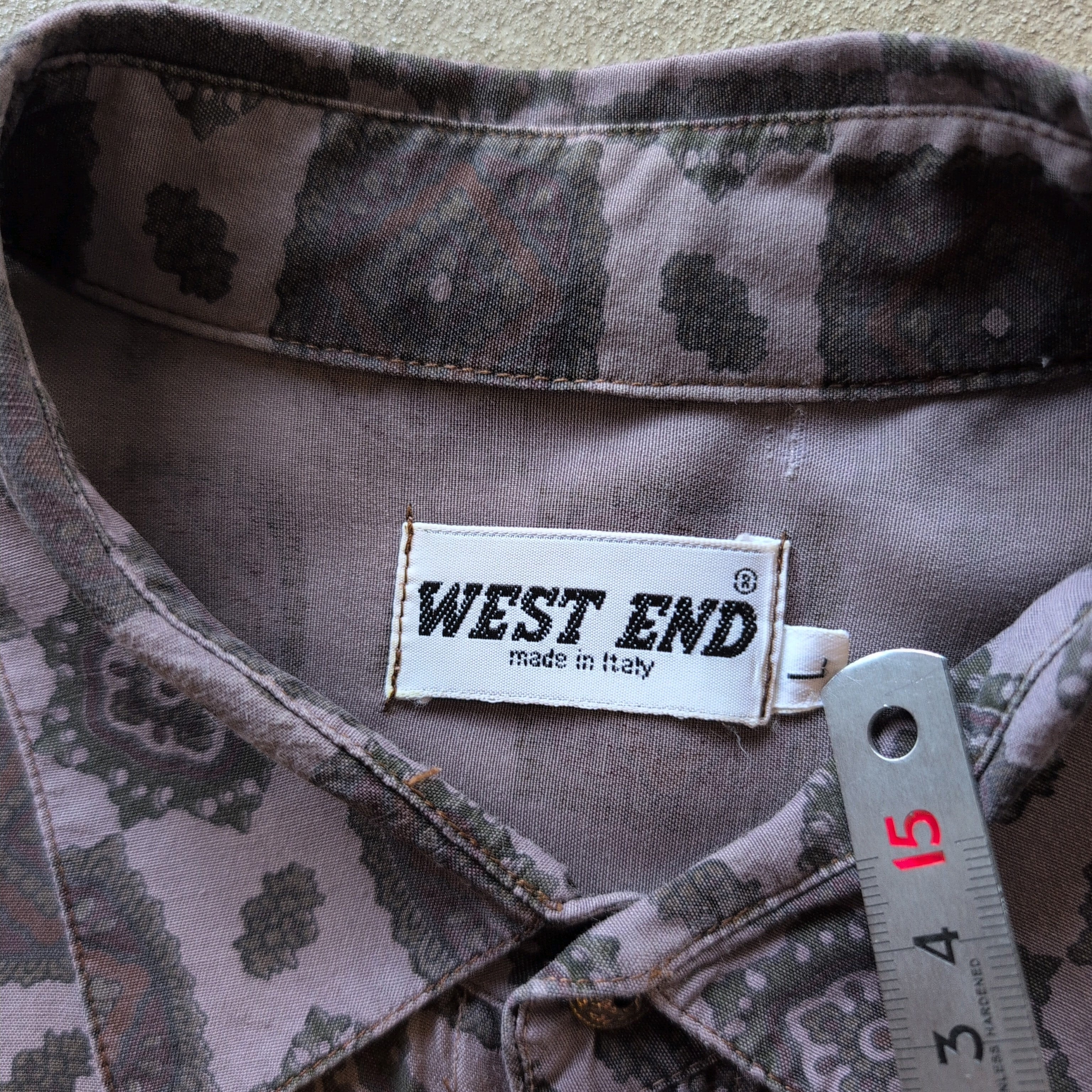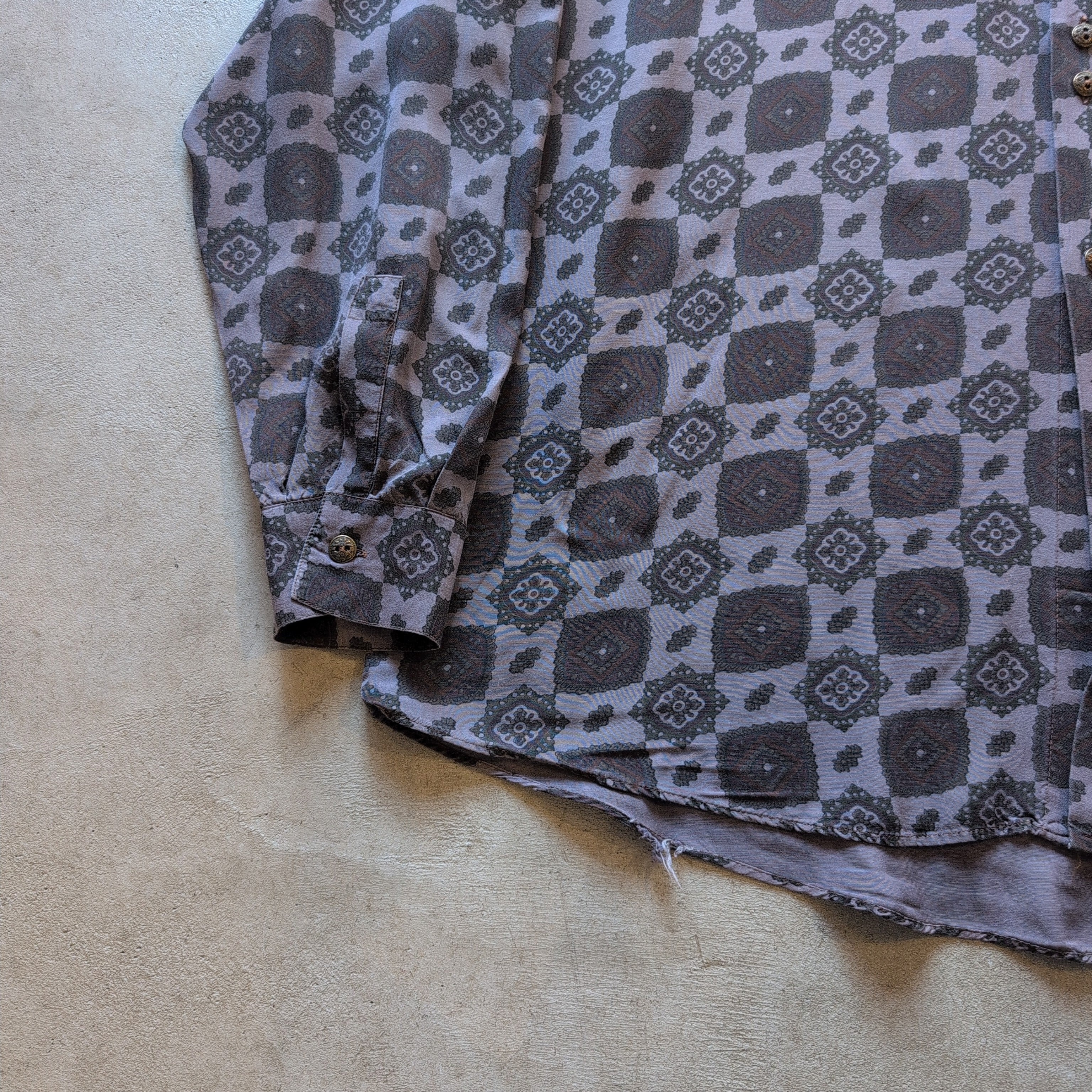 幾何学模様の様なデザインが総柄で描かれているシャツです