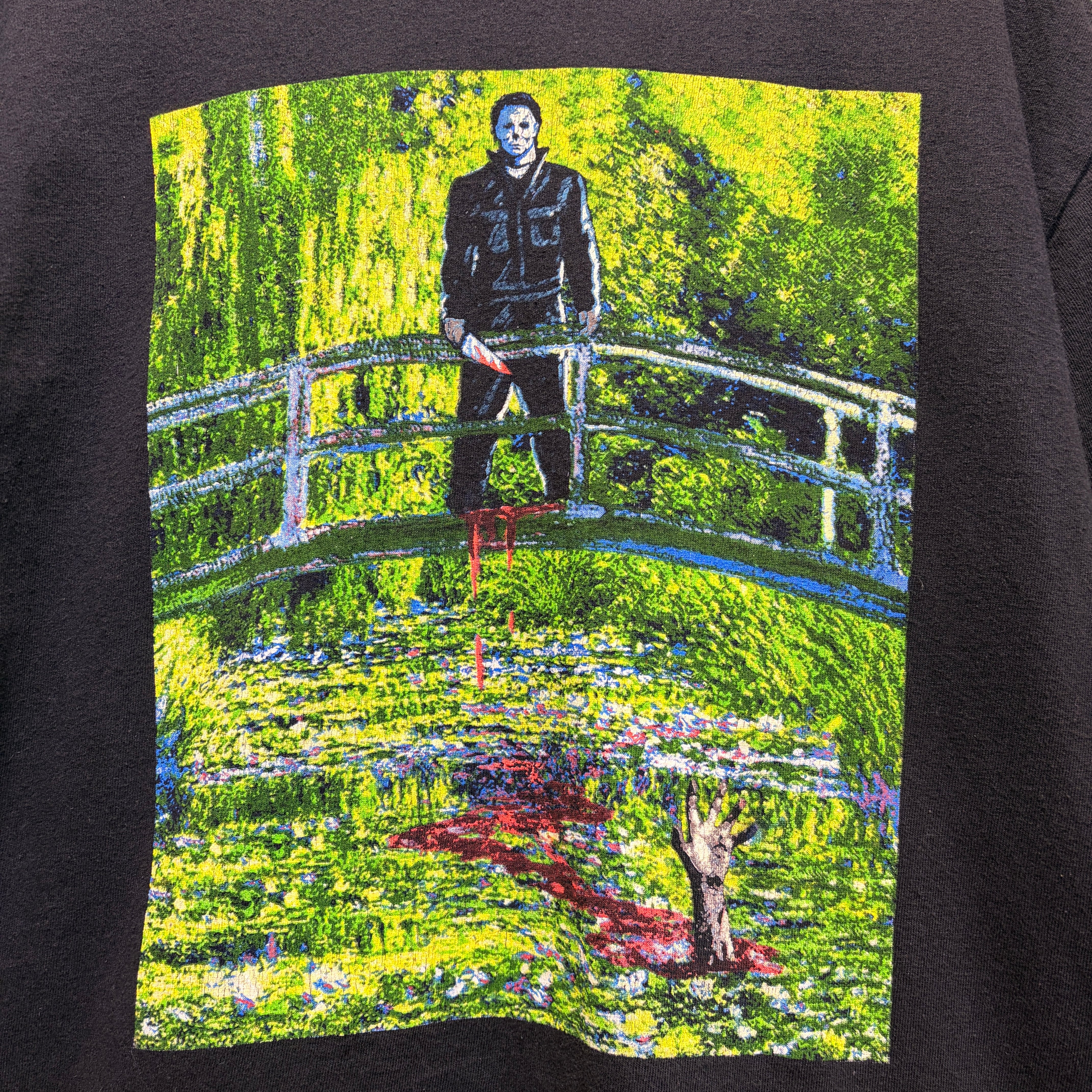 映画HELLOWEENのブギーマンと思われるキャラクターが、モネの睡蓮の池のような絵の中に立っています