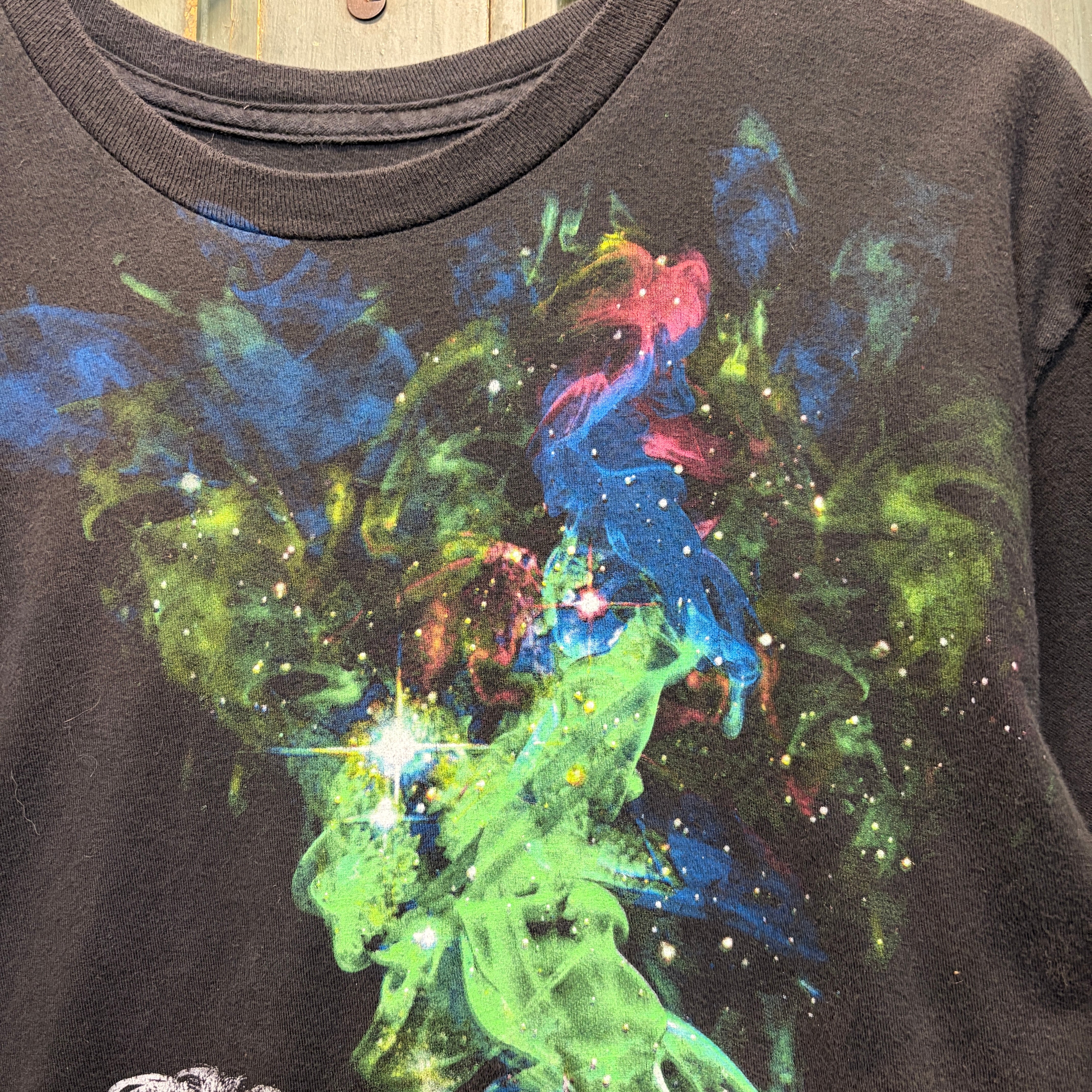 アインシュタインのプリントTシャツですアインシュタインの吐く煙が宇宙のようにデザインされておりアートTシャツのような雰囲気があります。