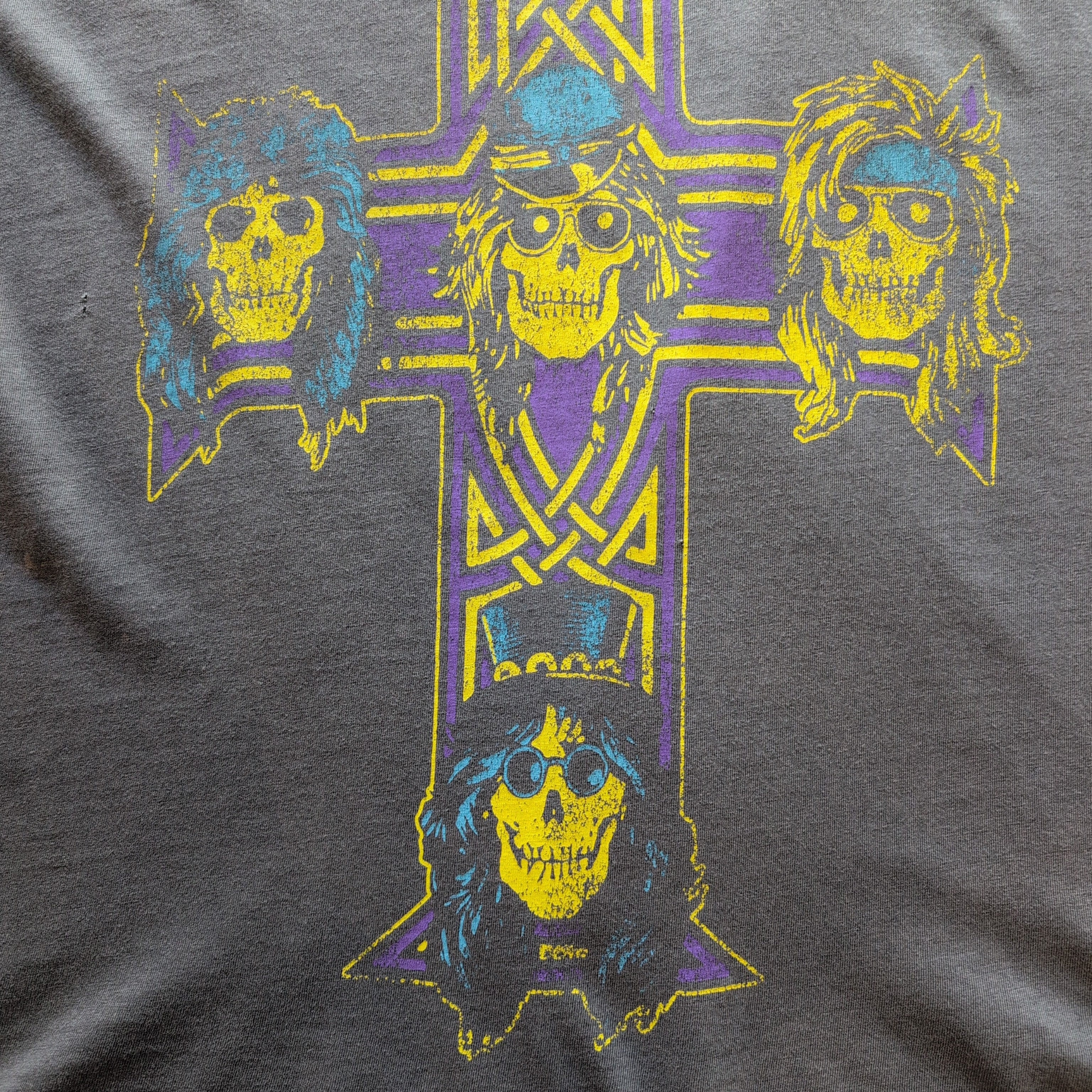 十字架にメンバー5人のスカルが配置されたバンドを象徴するグラフィックで、バンTスタイルにはもってこいだと思います