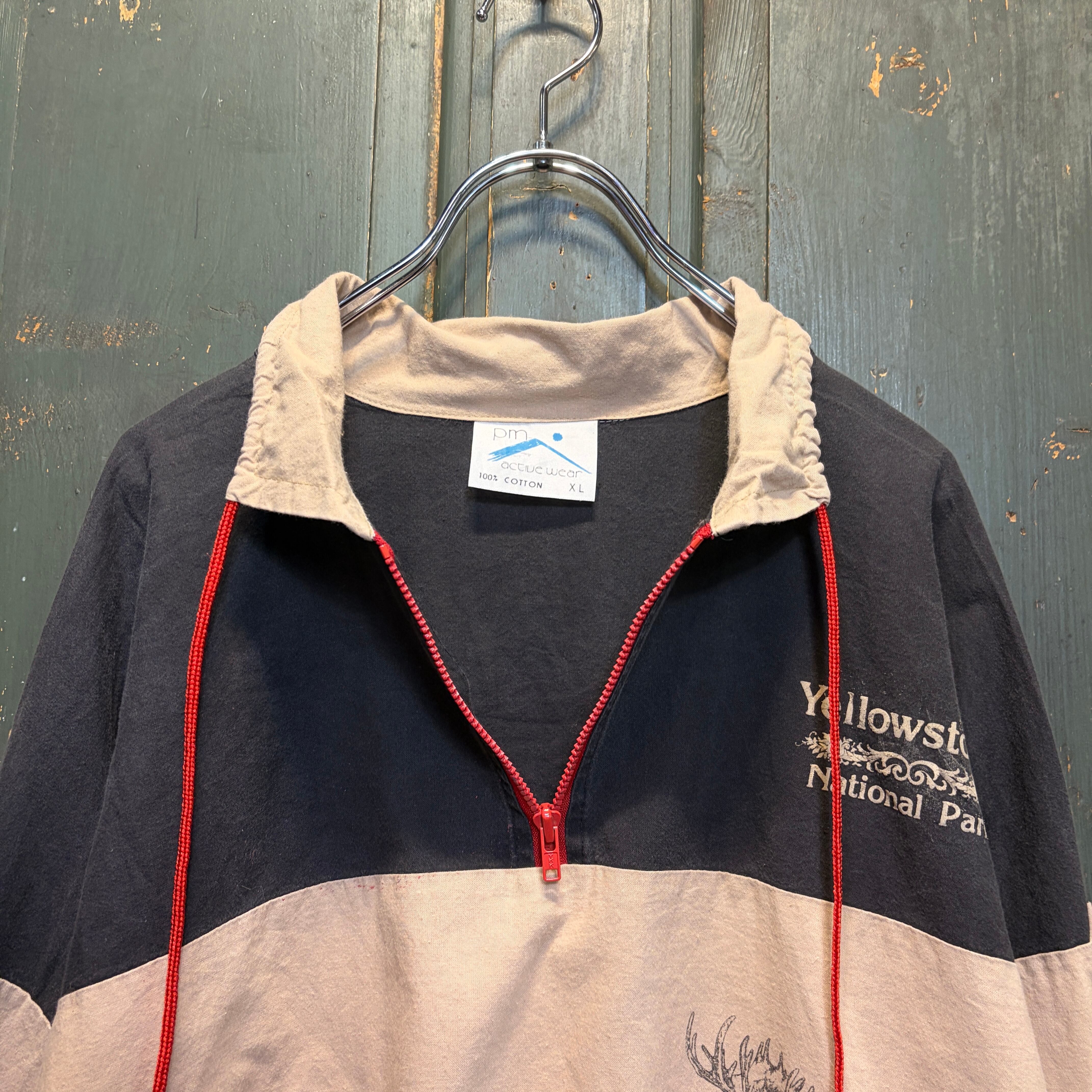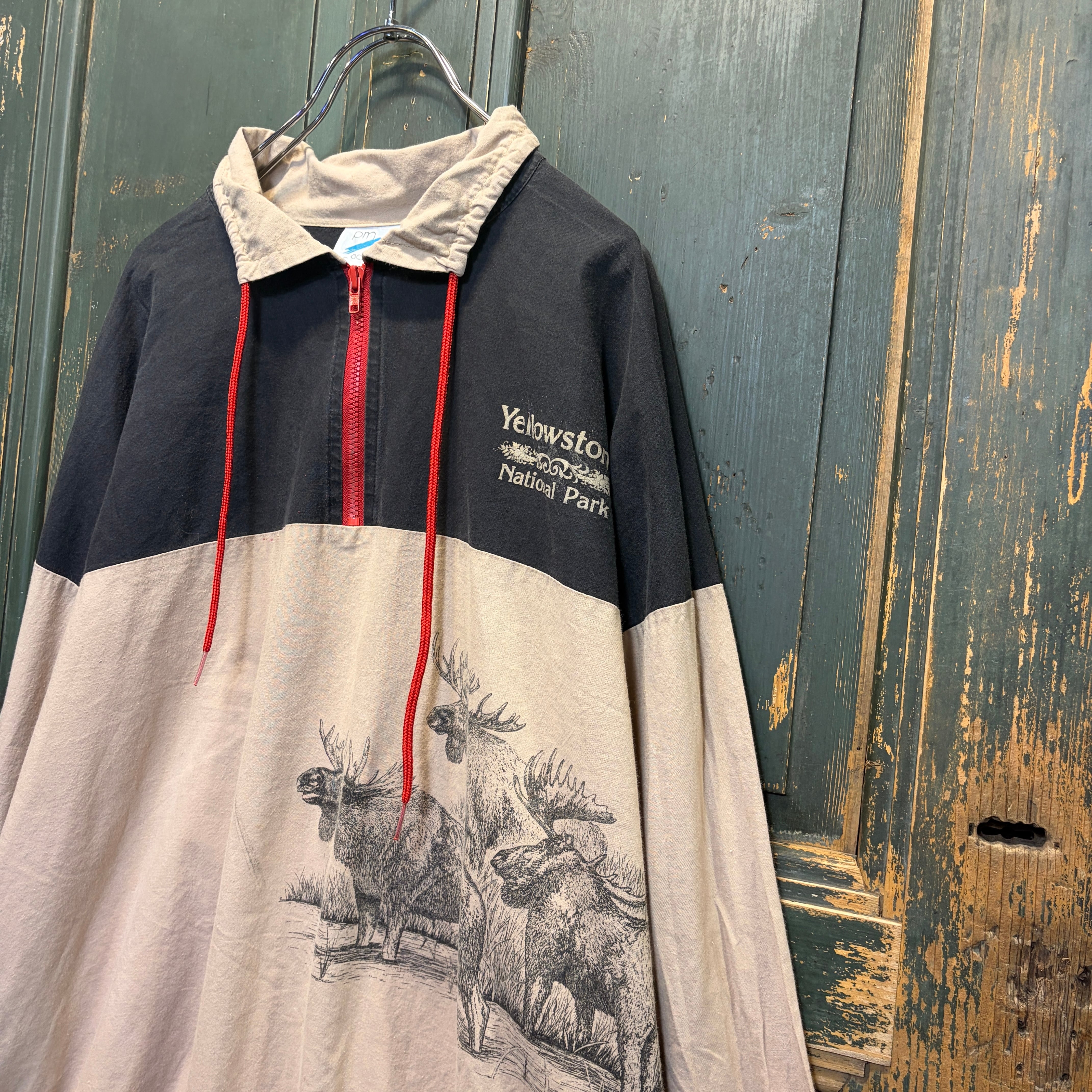 ヘラジカのイラストがプリントされたハーフジップのトップスです